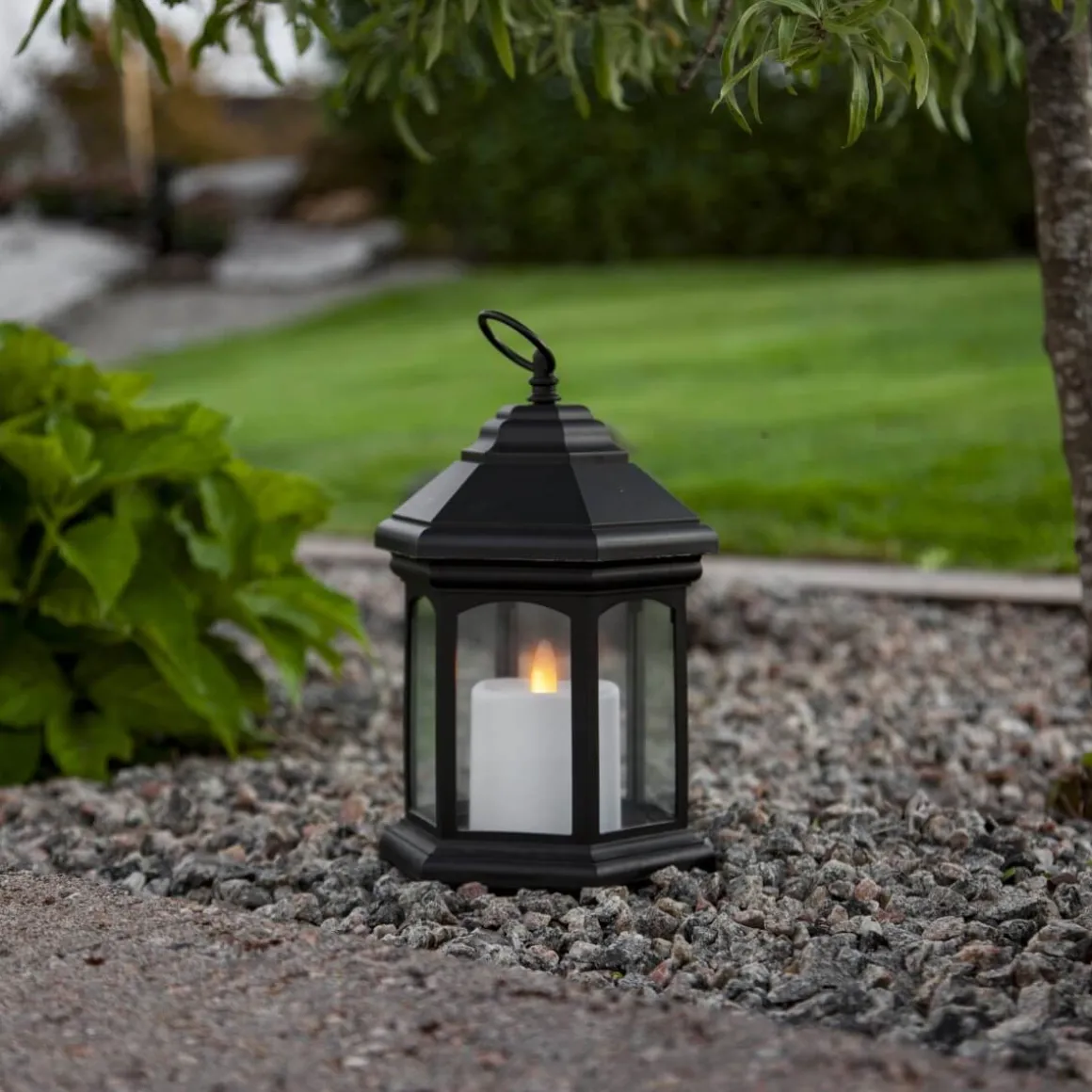 Vacker liten svart lykta för både utomhus och inomhusbruk med ett batteridrivet ljus med timerfunktion i mitten. Linta passar lika bra på det dukade bordet som på trappen.