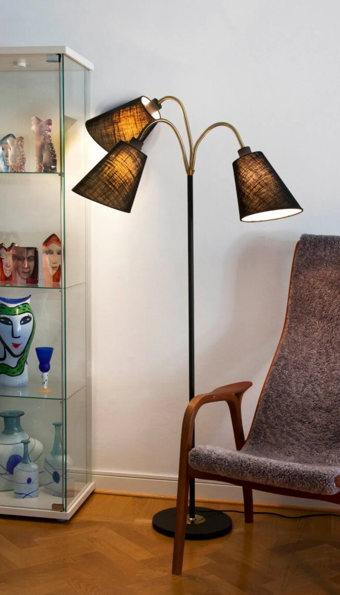 Perfekt golvläslampa från Aneta där du själv får välja vilken skärm du vill pryda underverket med. Ljusdal finns i lite olika färgar och olika antal armar. Här ser du Ljusdal i svart/matt mässing med en 3 läsarmar.