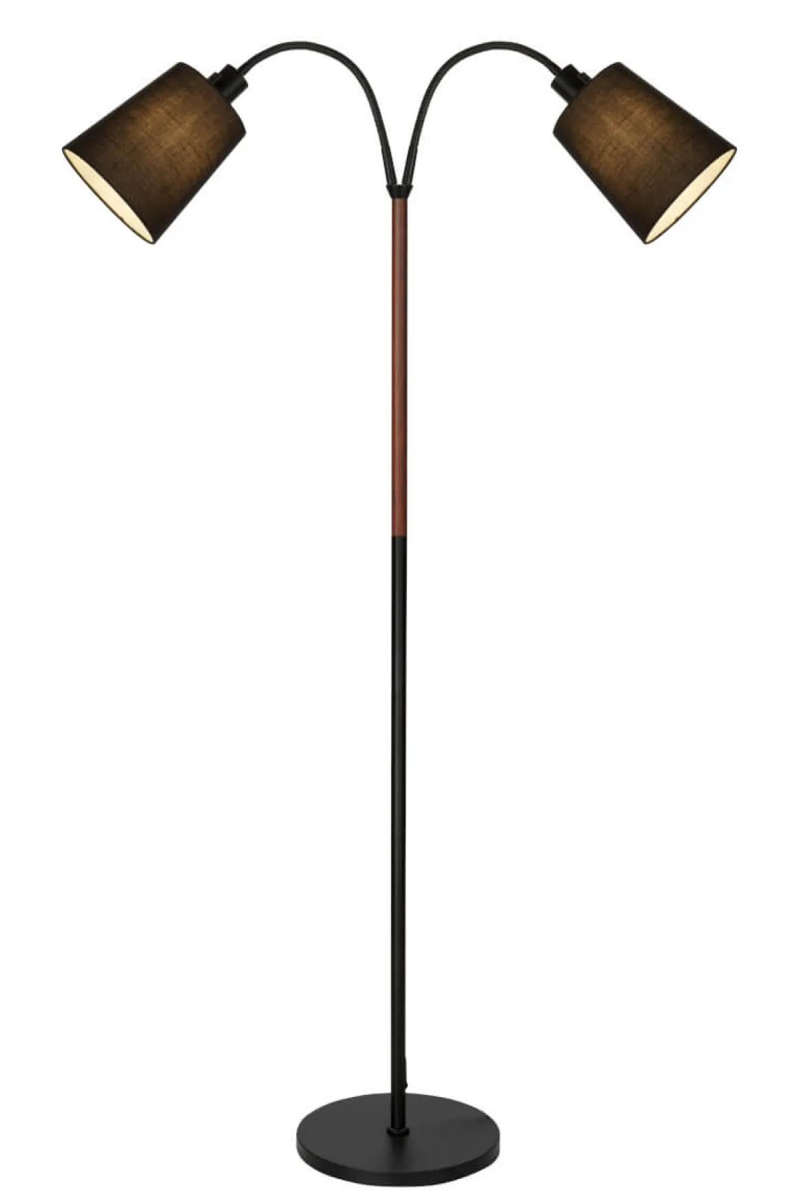 Komplett golvläslampa med två läsarmar från Aneta med svart fot med detalj i valnöt kombinerat med en svart skärm. Stilrent och snyggt.
