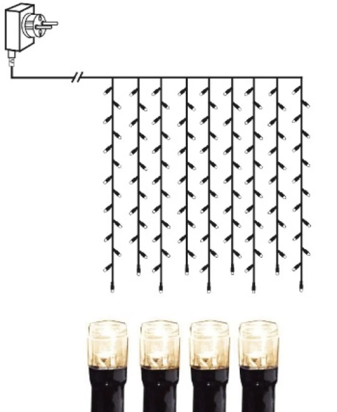 Ljusgardin med svart kabel och 100 varmvita LED-ljuskällor. Serie Mirco LED är perfekt att dekorera med utomhus.
