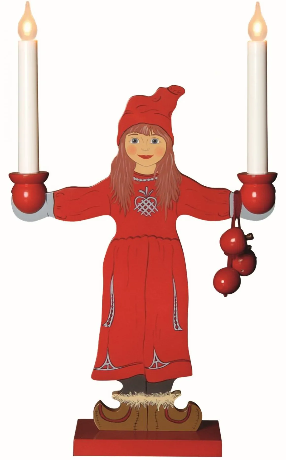 Sundborn, en vackert målad träljusstake med 2 LED lampor med varmt fint sken, gör sig lika bra i fönstret som den gör på en byro som ren å skär härlig juldekoration.
