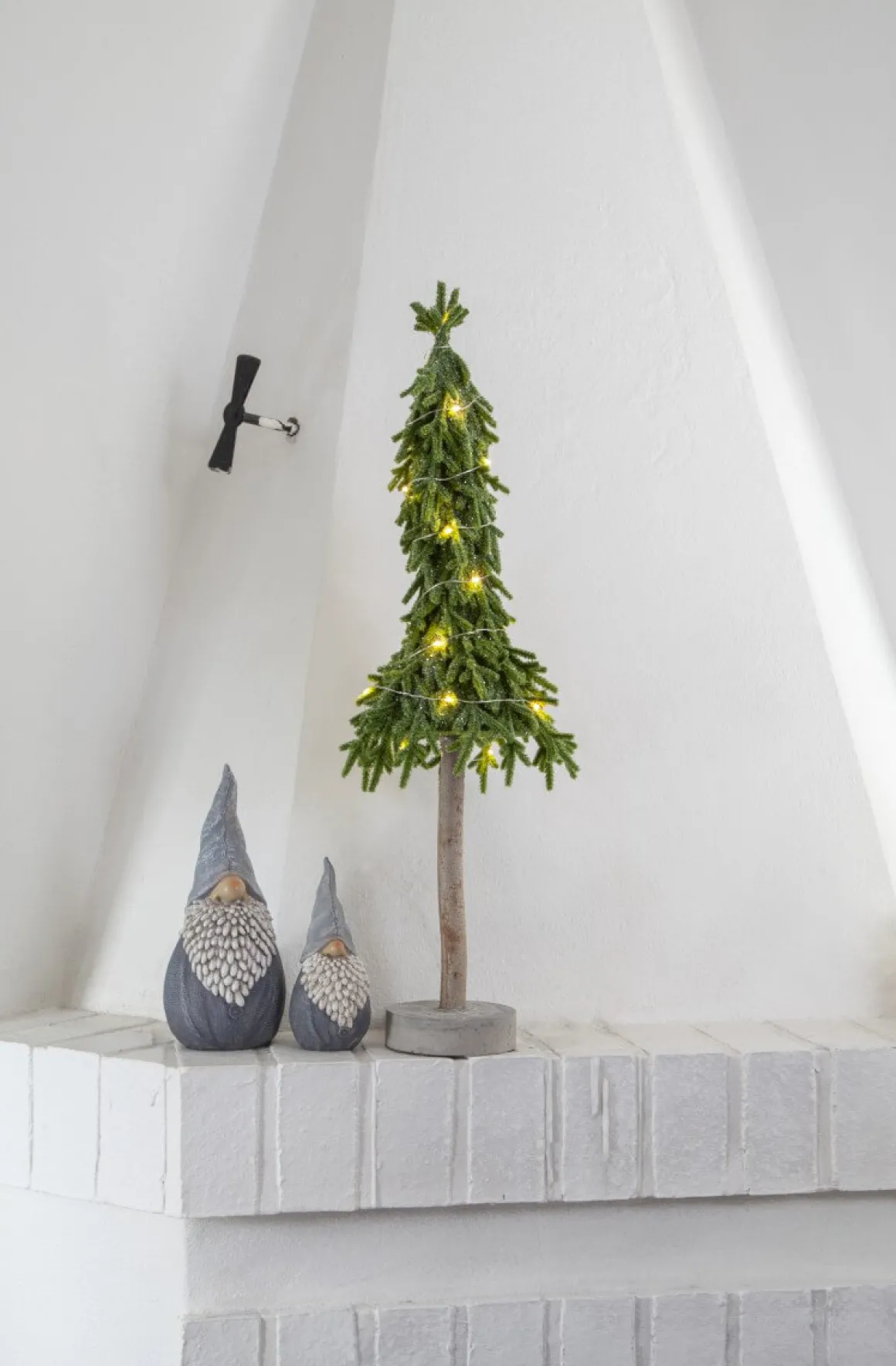 Bordsgran från Star Trading helt i PE material med lite glitter och fot av grå cement. Den höga lummer som du ser här lyser upp med 20 små varmvita dew drops.