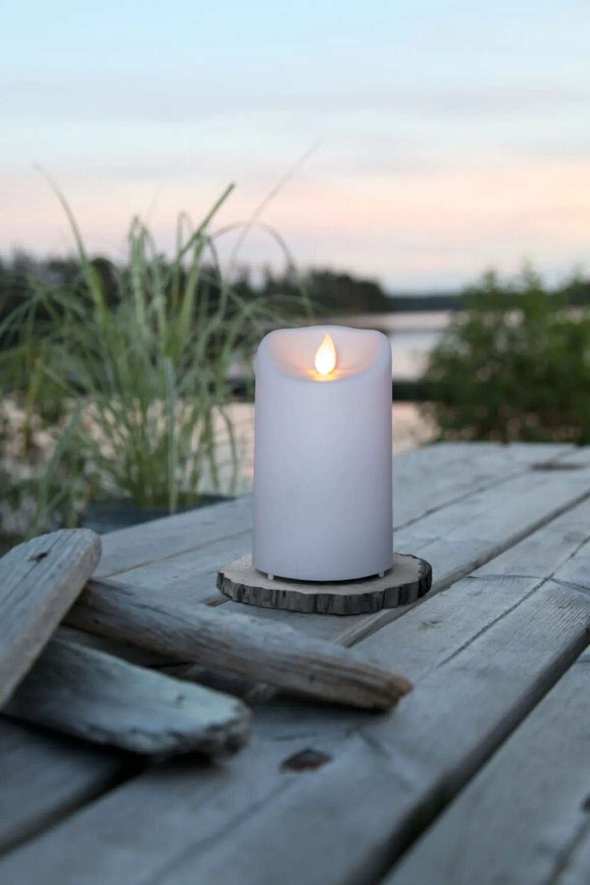 Så verklighetstroget 12,5 cm vitt ljus som är tillverkat i plast för att klara av att även stå ute i en lykta utan att smälta sönder och samman. Givetvis har ljuset en inbyggd timer!
