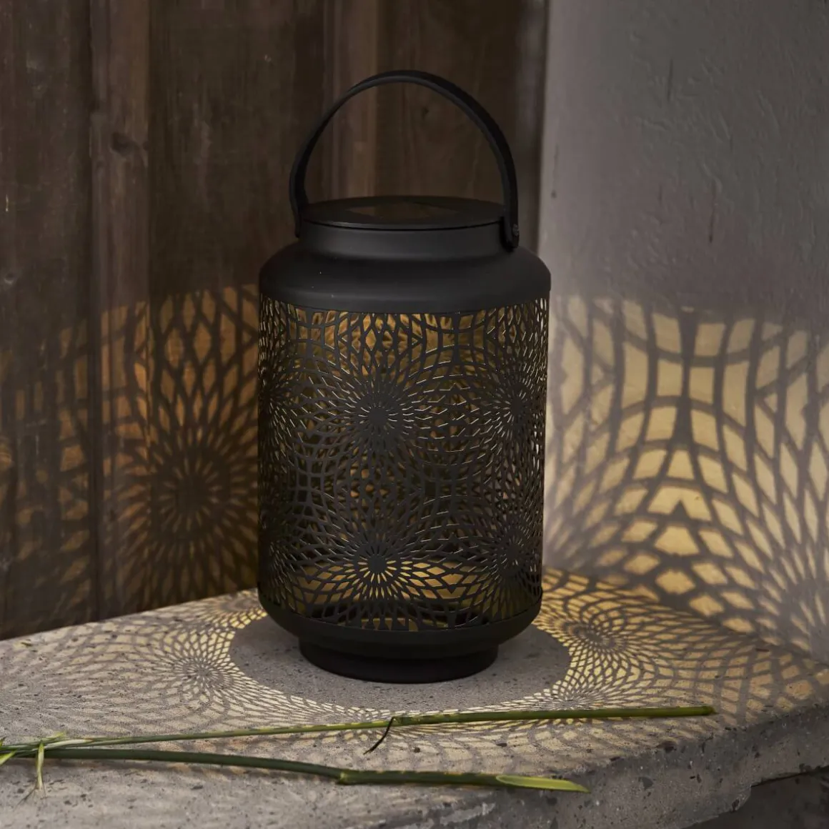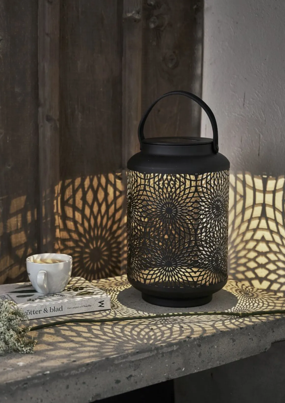 Star Tradings fina lykta Mandala är en solcellsbelysning gjord i svart metall med ett handtag i polyuretan. Det varmvita ljuset lyser vackert genom det stansade mandala mönstret och bildar en vacker ljusbild där den står. Lyktan är fin att placera i din trädgård eller på din balkong. Se till att placera solcellsdekorationen där solen kan nå panelen under dagen för att få ultimat laddning till det medföljande batteriet.