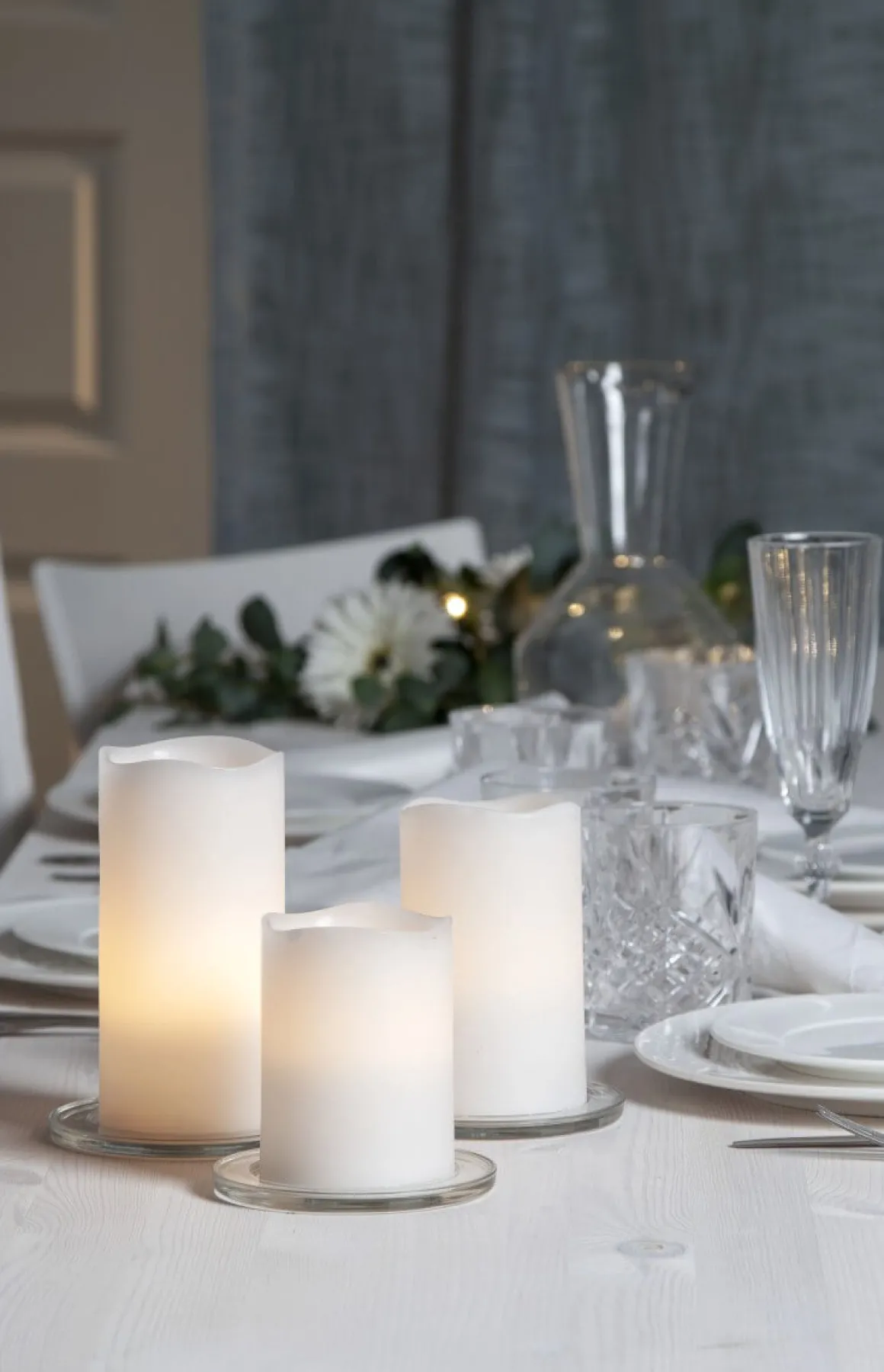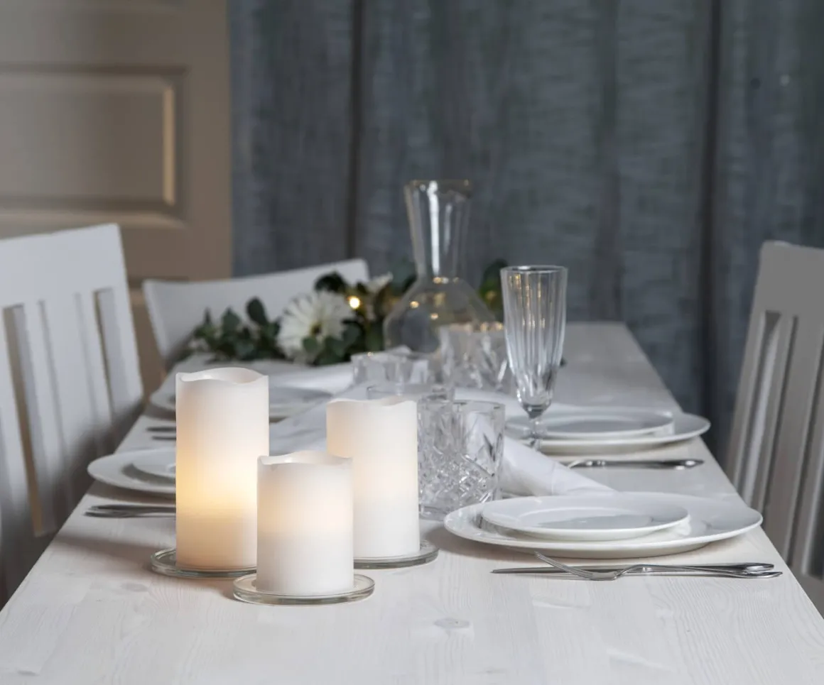 3-pack Vaxljus med en marmorerad vit yta och varmvitt sken från Star Trading. Ljusen är 10, 12,5 och 15cm höga. Fjärrkontroll med funktioner för timer (4 eller 8 timmar) och för ljusläge medföljer.