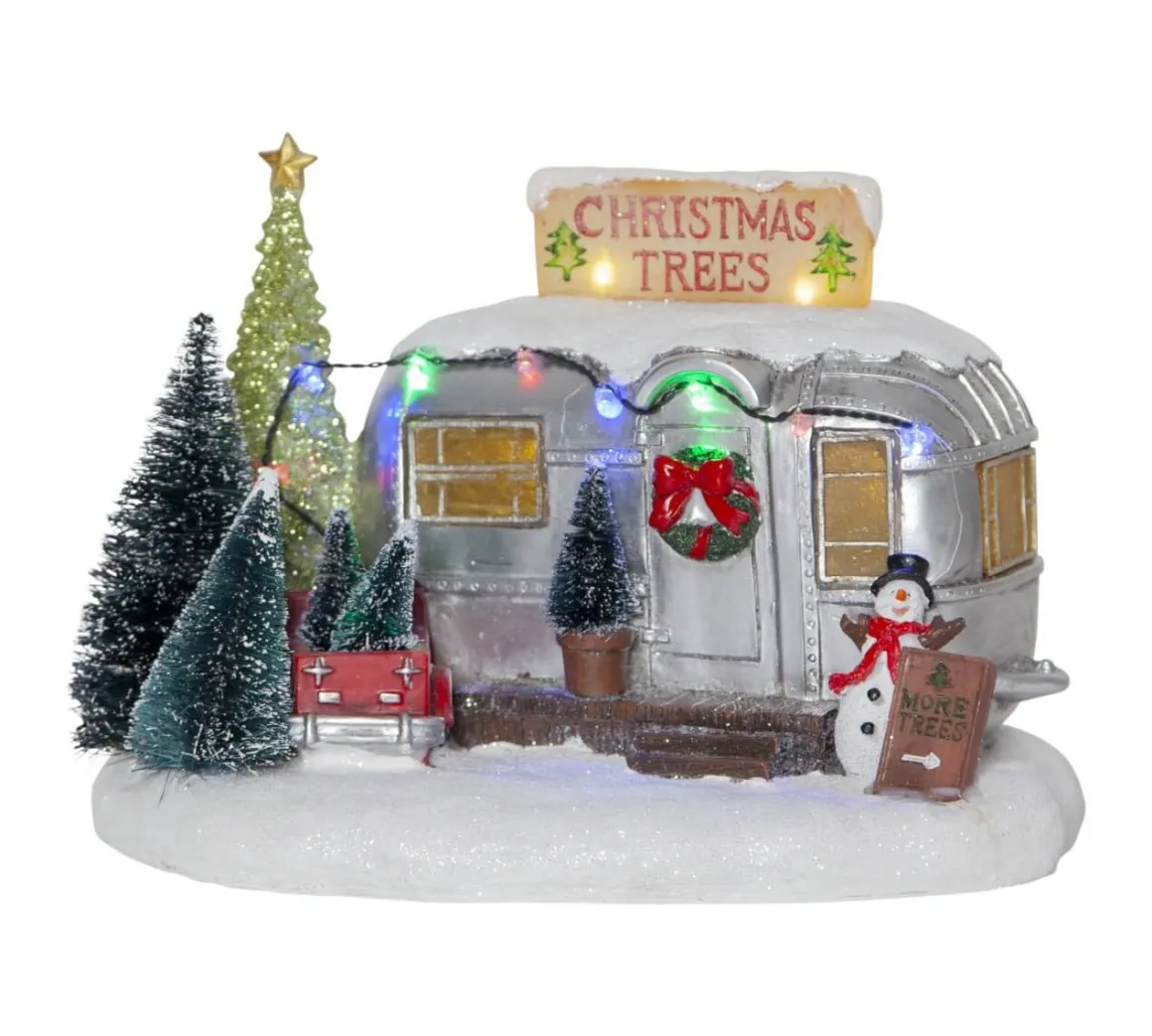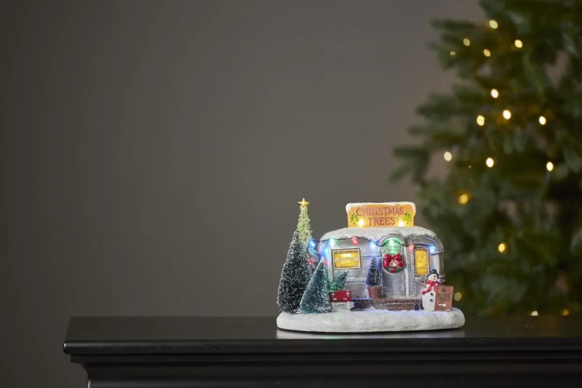Så söt dekoration från Star Trading med en liten Husvagn med julgransförsäljning utanför. Självklart med en lysande skylt och en härlig liten slinga i multifärg.