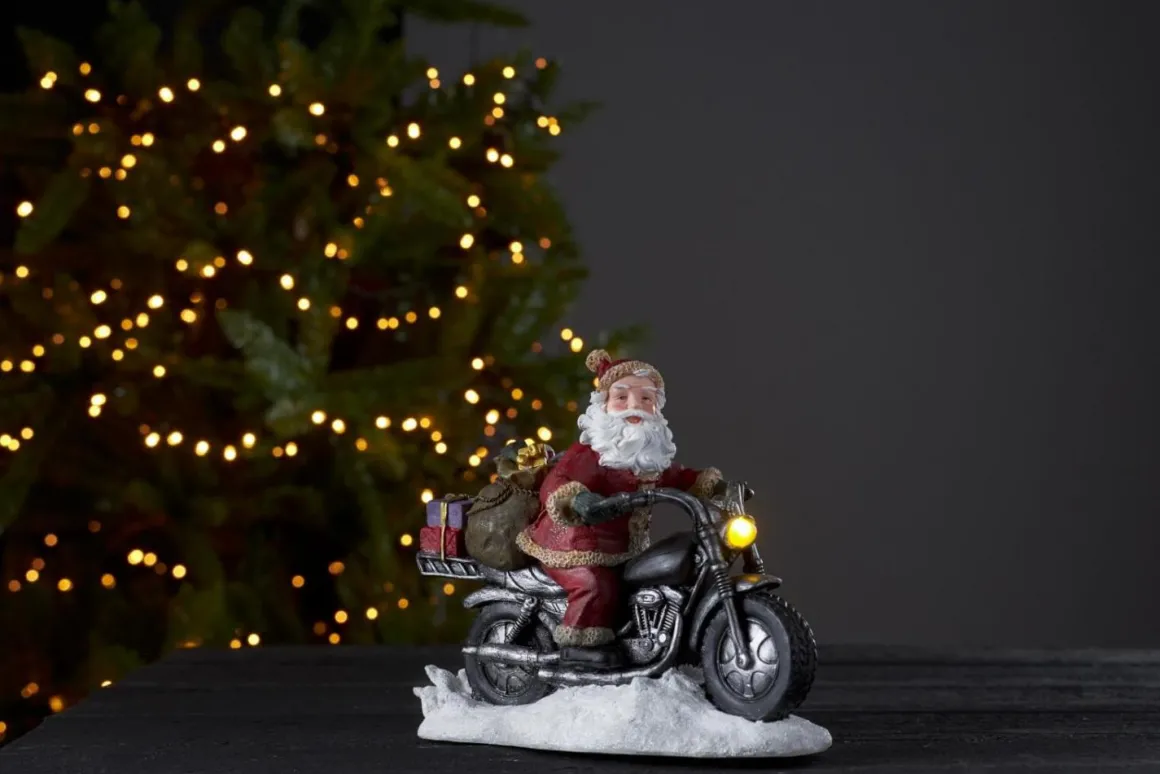 Tomten finner nya vägar att ta sig fram på 😉 här har han fått tag på en Motorcykel! Drivs med batterier och har självklart en inbyggd timer.