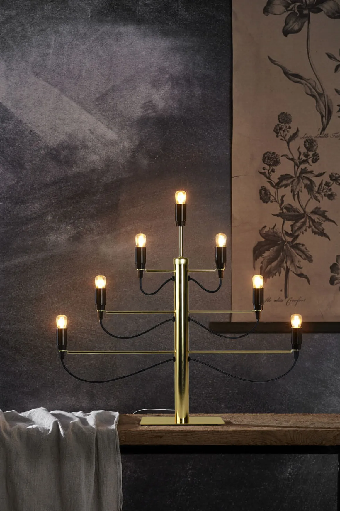 En riktigt tuff ljusstake för den som vågar ta ut svängarna! Med 7 stycken E14 ljuskällor bestämmer du själv vilken typ av lampa du vill ha i den. Det finns många varianter, bara att börja designa som du vill ha det!