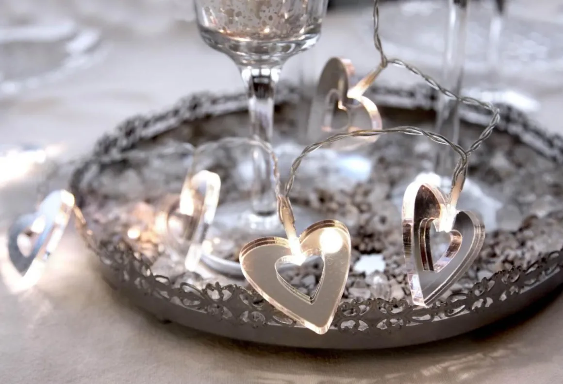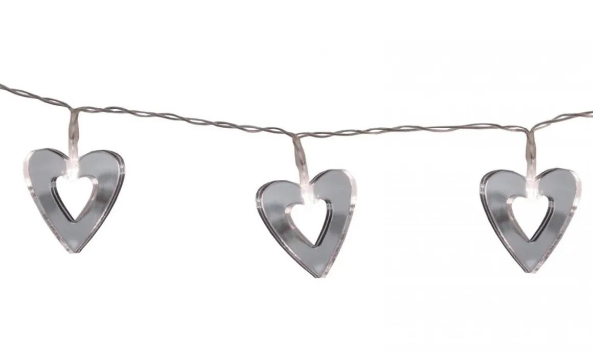 Vacker dekorationsslinga med 10 stycken LED-ljus i spegelhjärtan. Kan användas vid diverse dekorationer, vid tex dukningar, blomsterarrangemang, på väggen osv. Slingan är batteridriven och har en smidig timerfunktion.