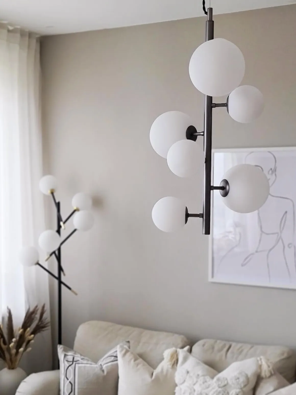 En av mina absoluta favoritlampserier från Aneta belysning är denna coolingen Molekyl här som lodrät Taklampa med hela 7 ljuskällor. Bara titta på den! stilren och enkel med en kul design och bara precis sådär rätt. Stomme i matt mässing med opalvita kupor.