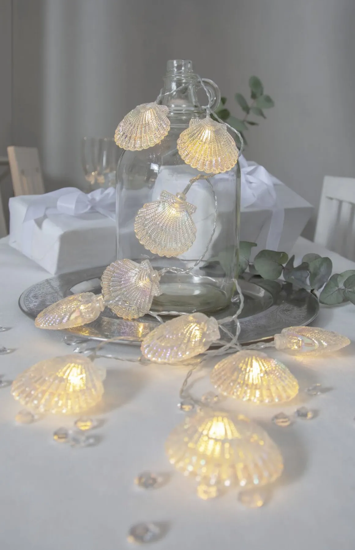 Vacker Ljusslinga dekorerad med 10 st transparanta snäckor. Placera ljusslingan på ett bord, hängandes på en vägg eller varför inte i granen. Dekorativ inredning som ger ett mysigt sken i hemmet. Batteribox med timerfunktion