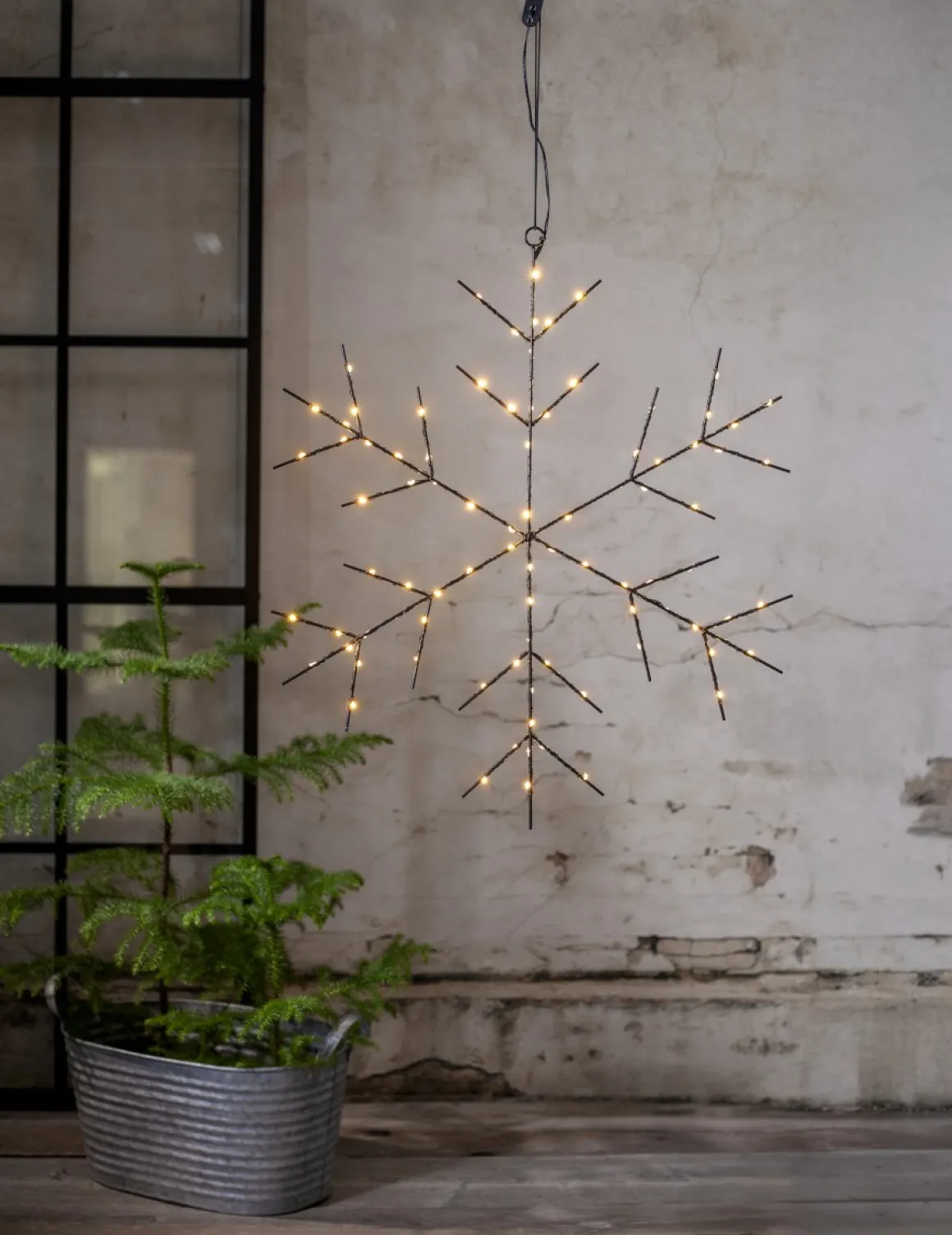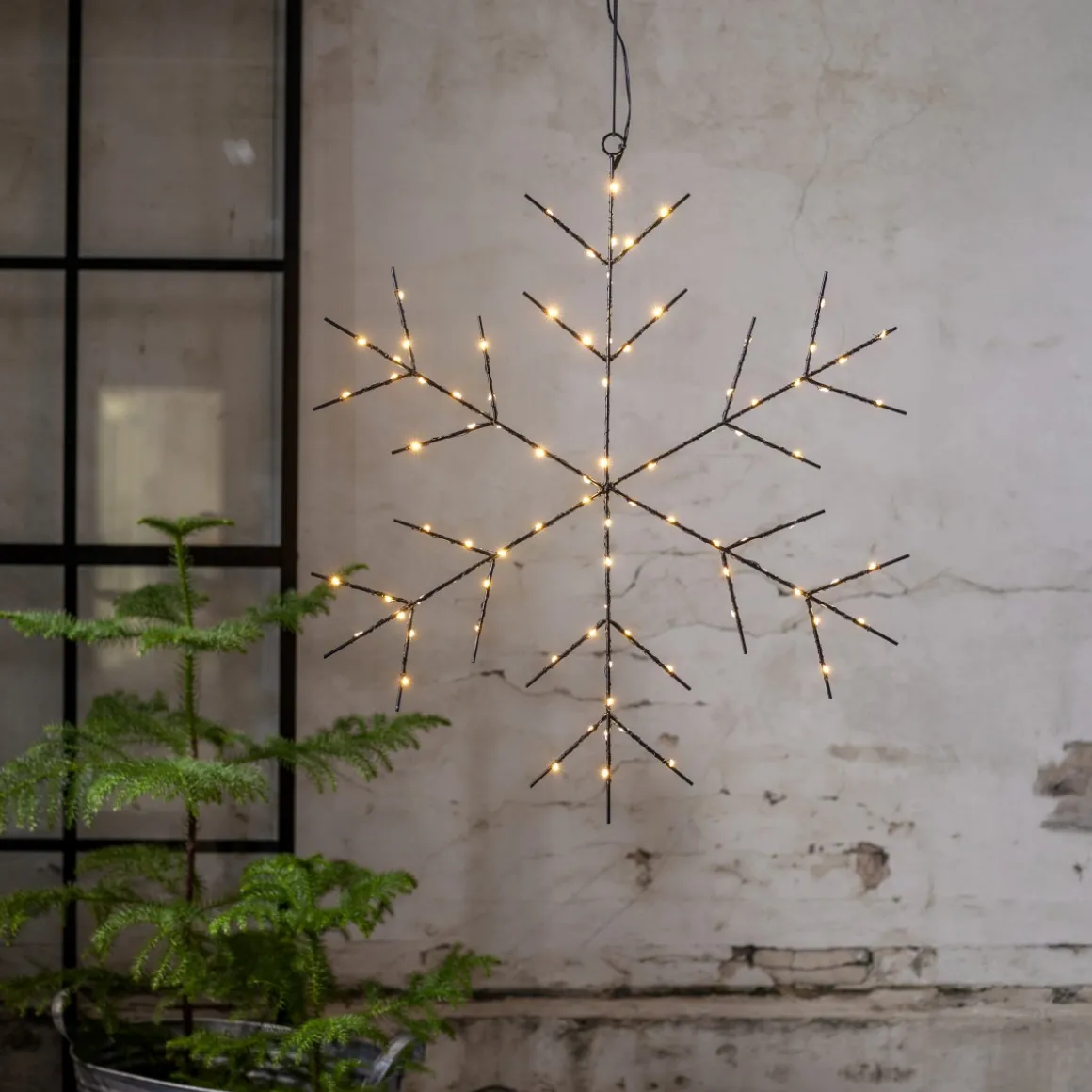 Skapa vintermagi med Niva lysande snöflinga från Star Trading! Denna metallsiluett med inbyggd ljusslinga och små varmvita LED-punkter sprider ett mysigt sken. Häng i fönster eller på vägg för elegant julstämning. Med timer och tre ljuslägen för perfekt anpassning. En tidlös dekoration som lyser upp hemmet hela säsongen!