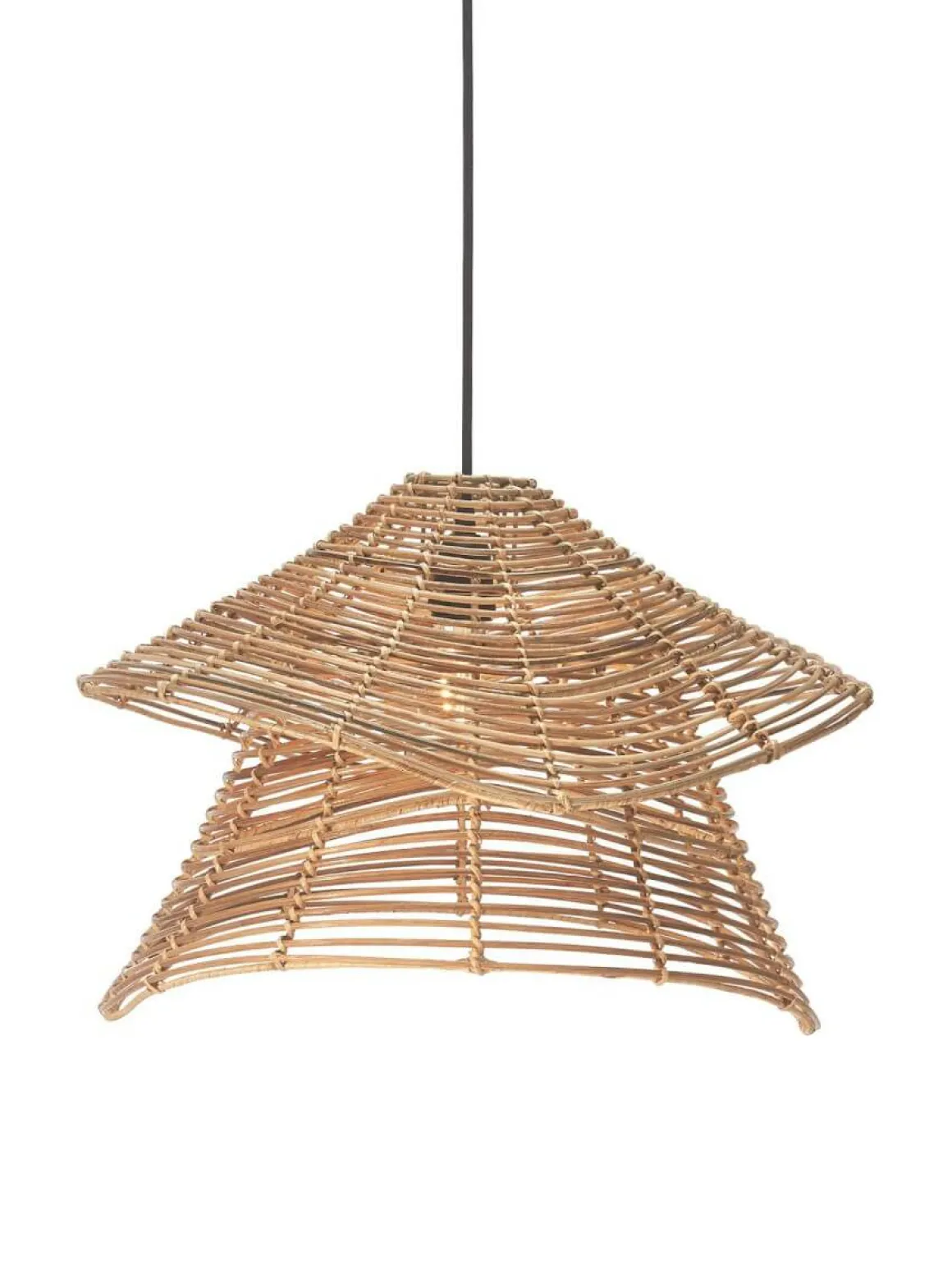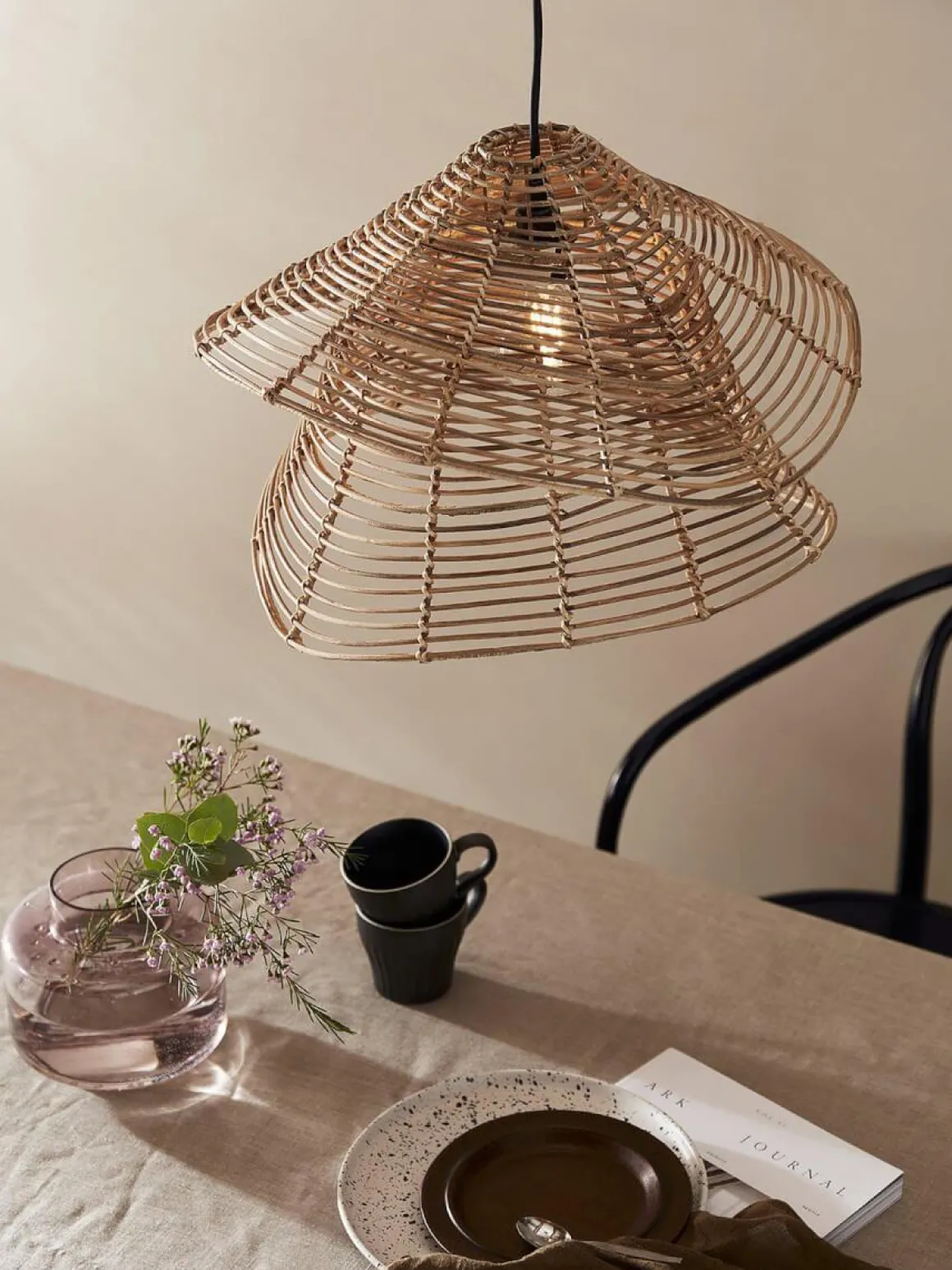 Som vi älskar Olga taklampa från PR-Home i handflätad naturrotting. Titta bara på skärmen med dess unika tvådelade form som silar ljuset och skapar ett vackert skuggspel. Tänk på att då den är tillverkad i naturmaterial, kan det förekomma mindre storleksavvikelser samt att färgen kan förändras över tid. Svart takupphäng med takkopp för inomhusbruk ingår. Ljuskälla och takkontakt köpes separat.