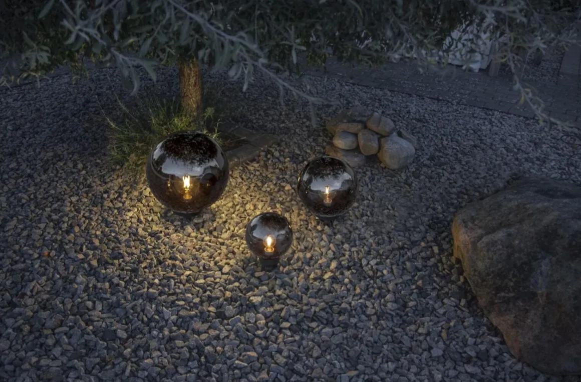 Äntligen är de här, Orby trädgårdsdekoration i form av ett rökfärgat klot med en E27 sockel i mitten så du enkelt kan sätta din egna personliga stil på underverket med val av ljuskälla. Orby gör sig lika väl ensam som i sällskap av sina kompisar i varierande storlekar. Här ser du stora Orby på hela 44 centimeter.