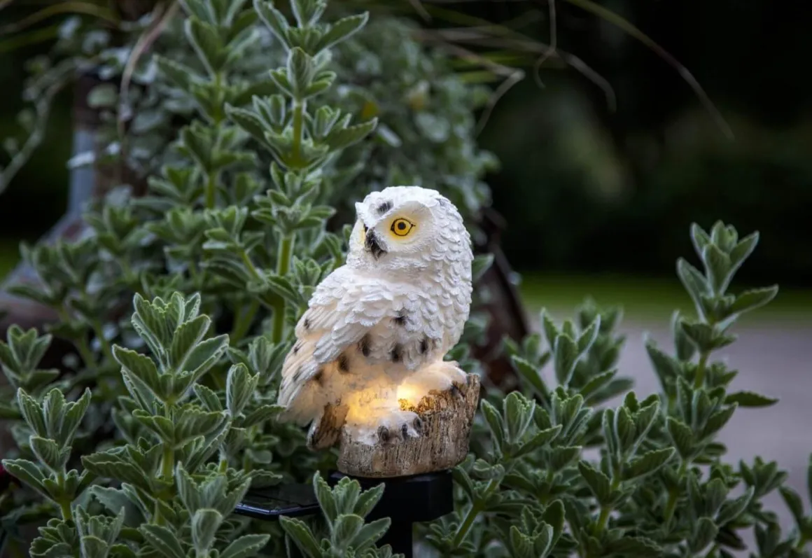 Vacker solcellsdekoration i form av en Uggla som laddas upp av solens varma strålar under dagen för att sedan lysa upp så vackert när mörkret kryper sig på.