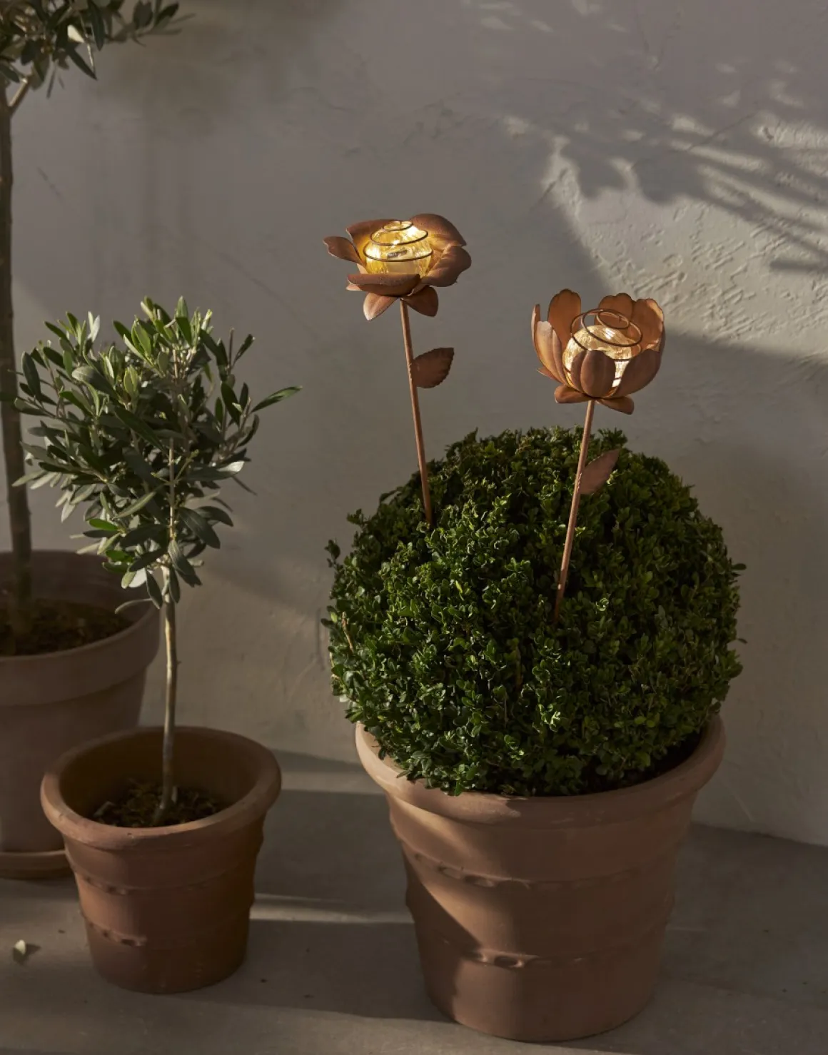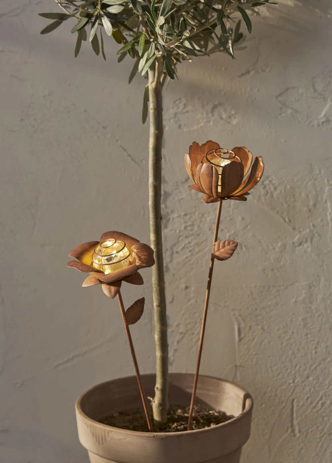 Lättplacerade små söta solcellsbelysningar med formen av två olika blommor som lyser upp av sig själv när det mörknar. Lyser gör dem med ett varmt och behagligt sken som blinkar lite lätt i mörkret.