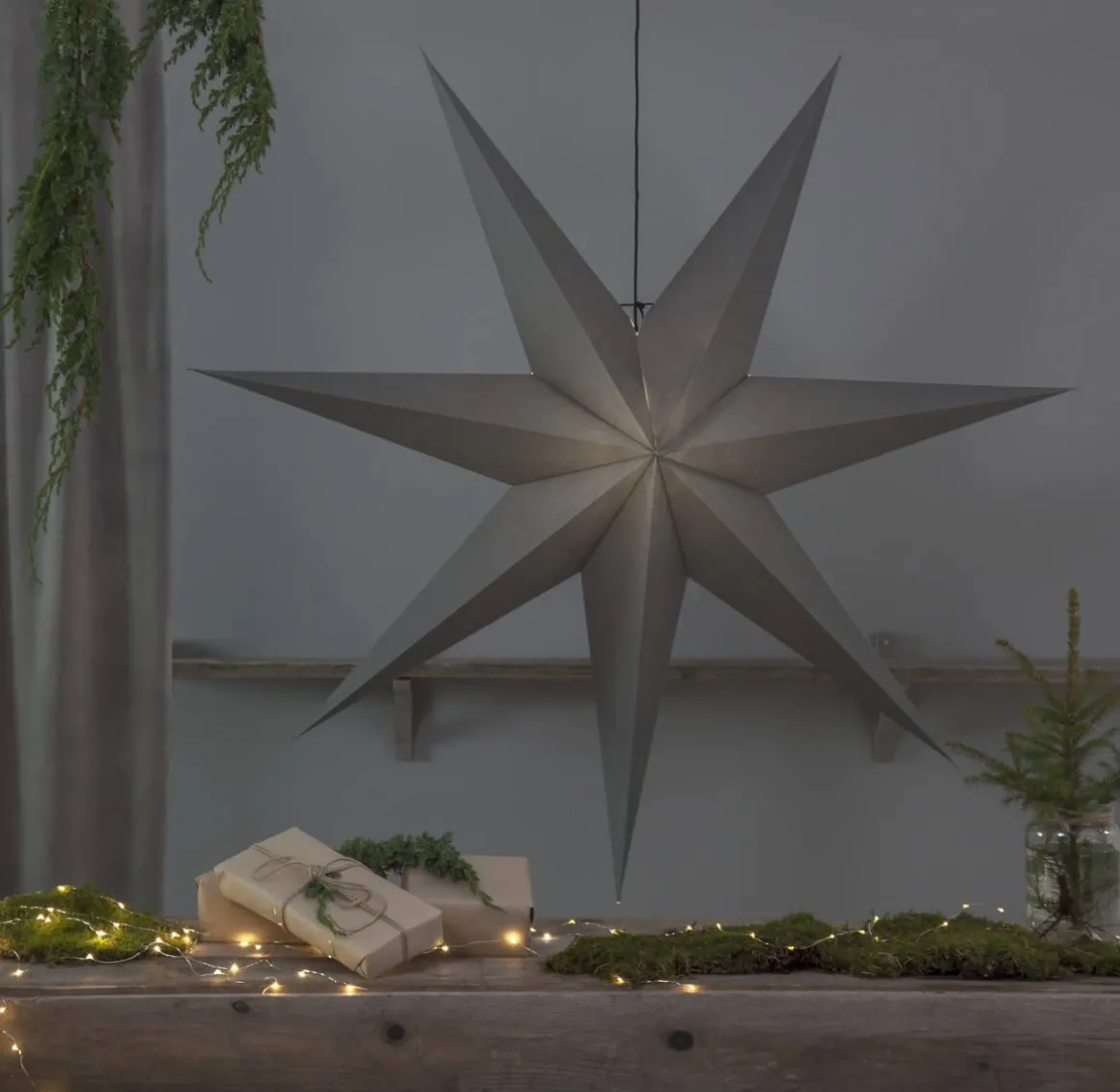 När stilrent och enkelt får vara bäst och störst! Ozen är en helt slät stjärna i grått med svart kabel, dess enkelhet blir blir ett självklart blickfång i ditt hem!