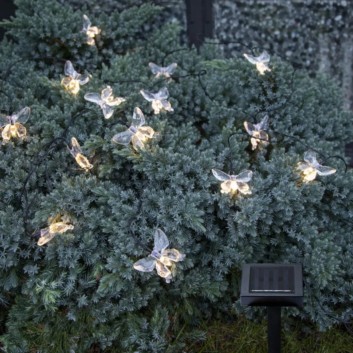 Kolla in Star Tradings vackra solcellsdrivna slinga Papillon med 15 små söta akrylfjärilar som lyser upp i mörkret med ett varmvitt behagligt sken. Denna solcellsbelysning har 20 cm mellan ljuspunkterna som ger en 280cm lång slinga. Själva paneldelen sitter med 1 meters kabel från den sista fjärilen, detta gör det enkelt att placera panelen i direkt solljus vilket är nödvändigt för att ladda batteriet som medföljer.