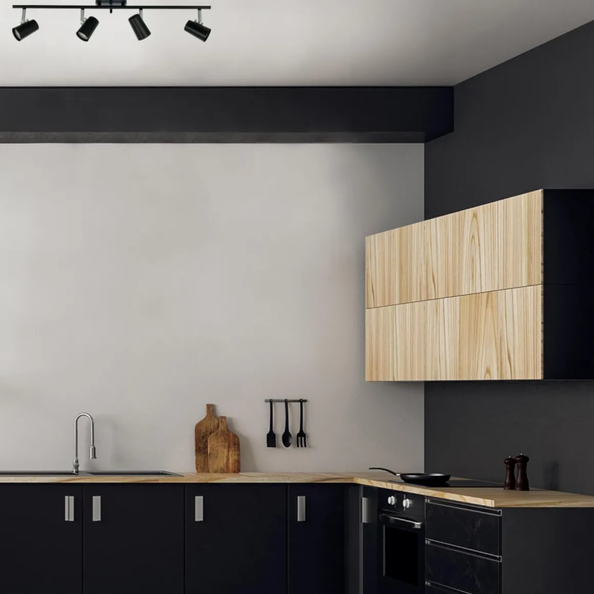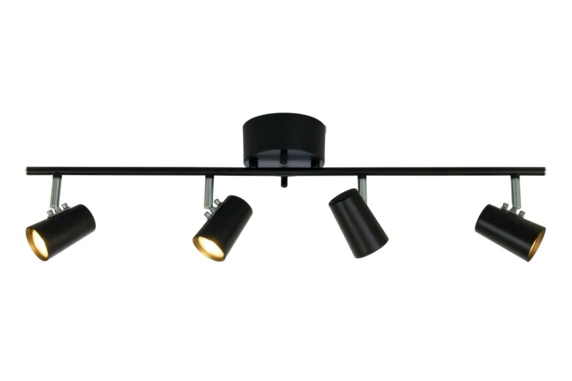 Perfekt basspotlight från Aneta med krokupphäng och fyra riktbara spotlights i Svart. Här ser du Pilot som en rak taklampa men den finns även i rund modell.
