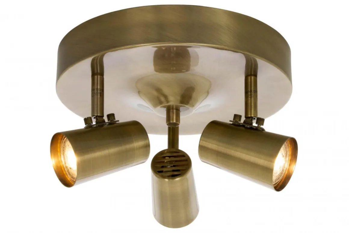 Perfekt basspotlight från Aneta med krokupphäng och tre riktbara spotlights i antikmässing. Här ser du Pilot som en rund taklampa men den finns även som en rak skena.