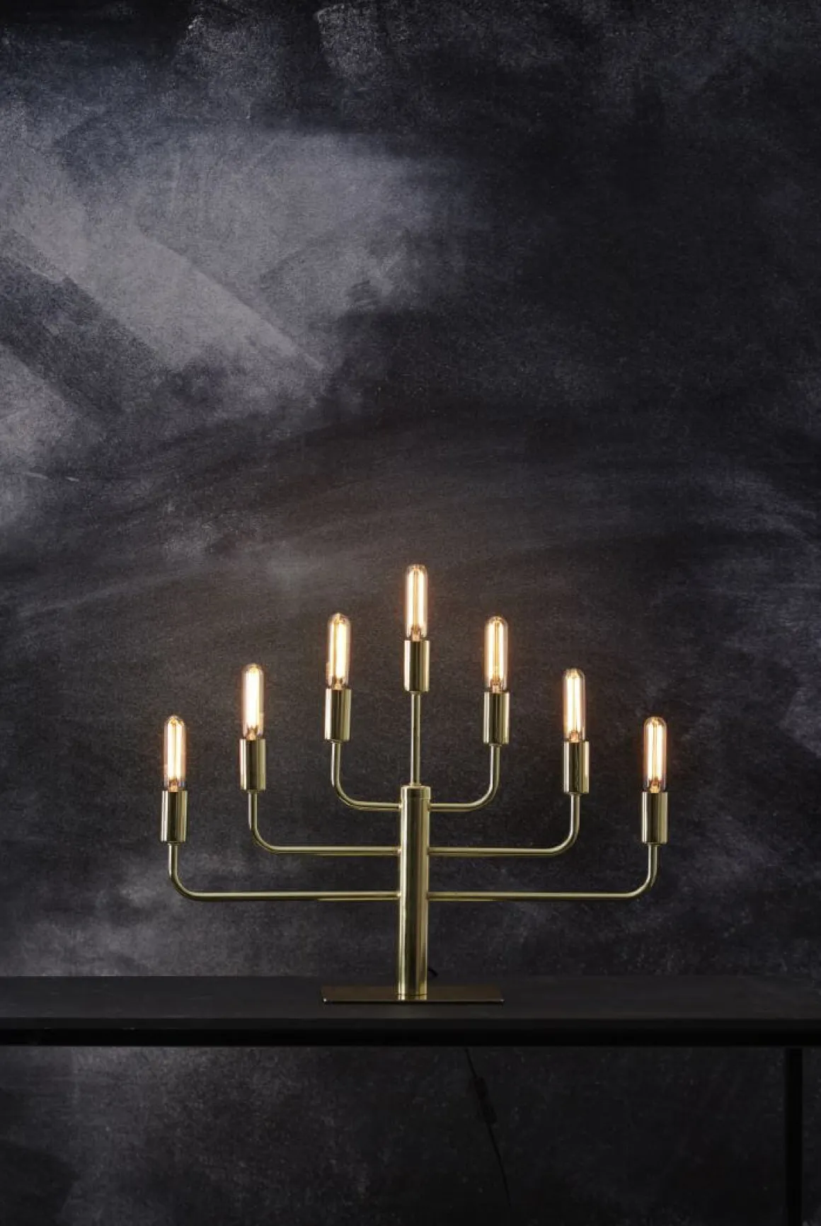En tuff ljusstake i Mässing för den som vågar ta ut svängarna! Med 7 stycken E14 ljuskällor bestämmer du själv vilken typ av lampa och stämning som önskas. Det finns många varianter, bara att börja designa som du vill ha det!