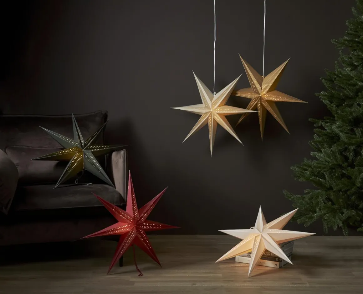 Nätt guldfärgad pappstjärna med ett dekorativt hålmönster och spännande vikning. Modern adventsstjärna att dekorera dina fönster med eller luta/häng mot en vägg.Dekorera till advent och få den där härliga julstämningen.