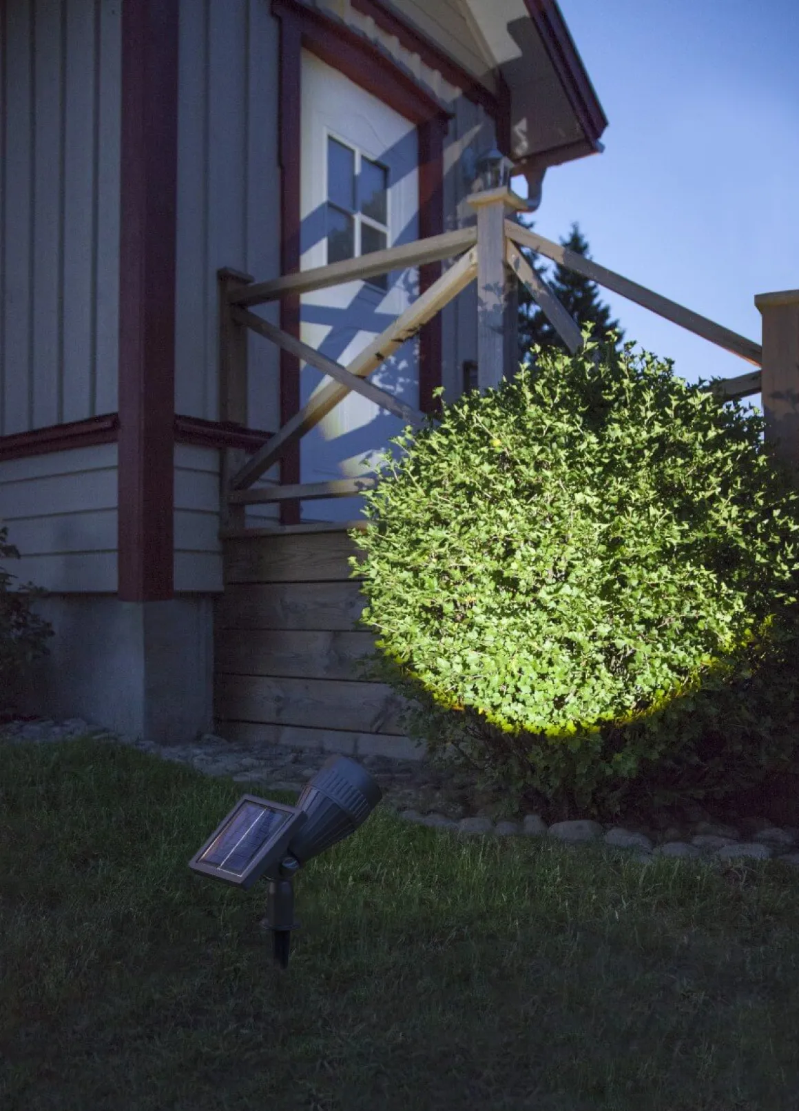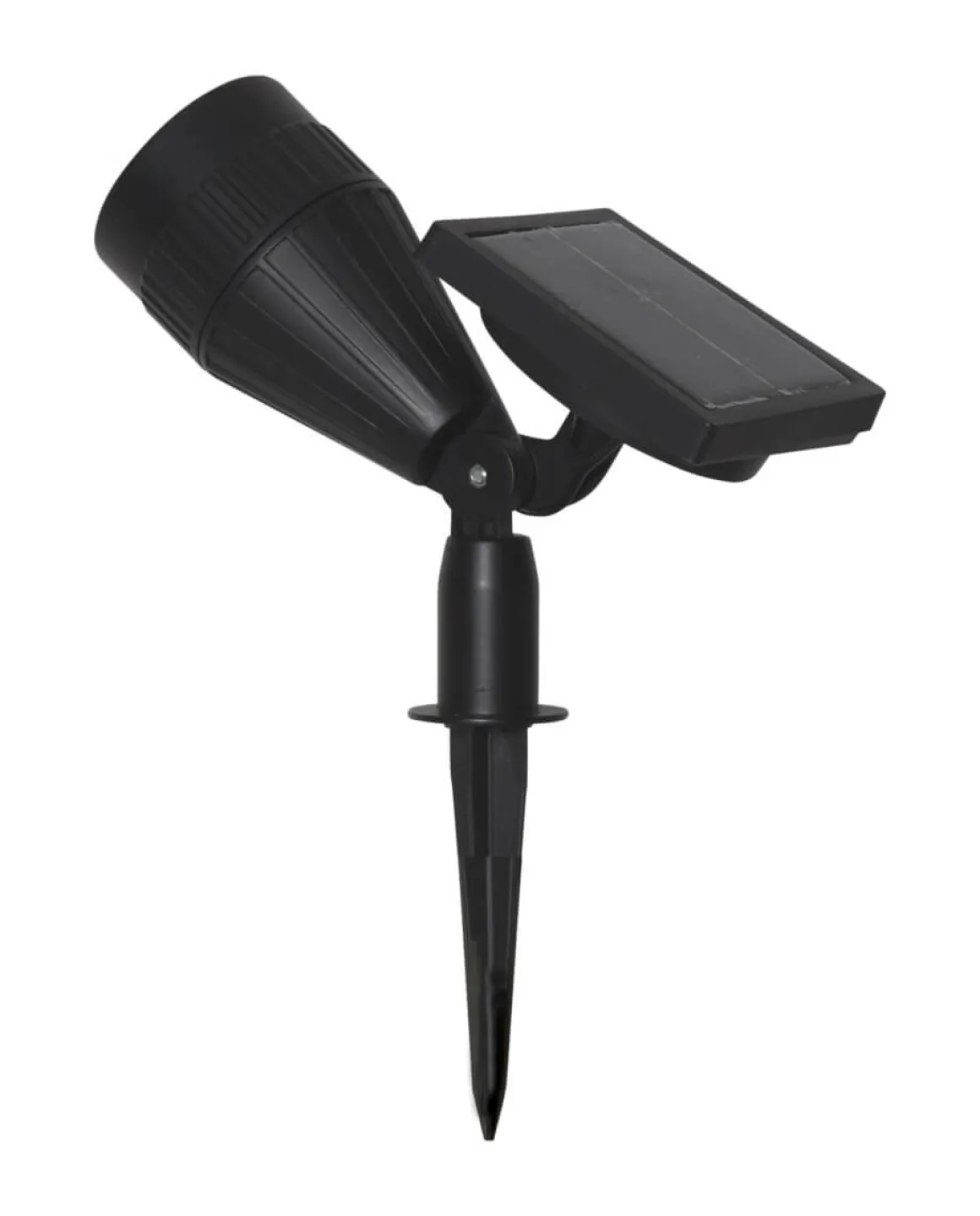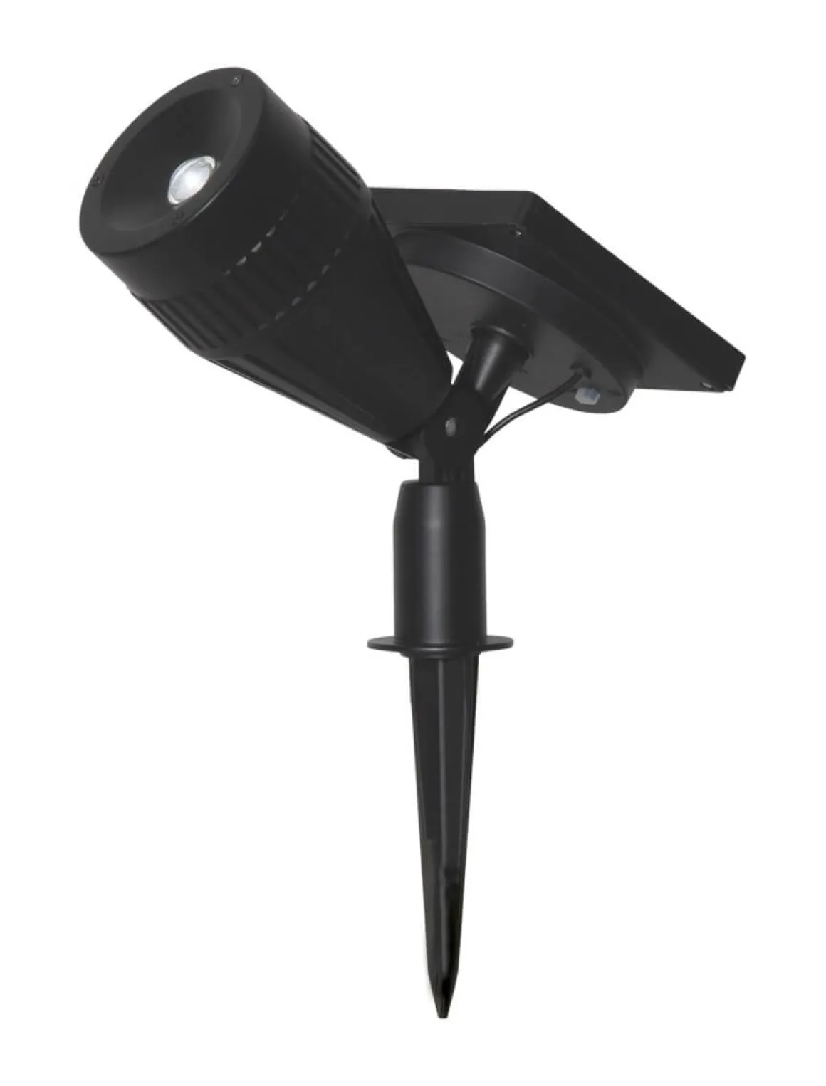 Svart solcellsdriven spotlight som lyser med en effekt på 50 lumen, tänds gör hen när mörkret kryper på och lyser sedan i ca 5 timmar innan hen slocknar för natten.
