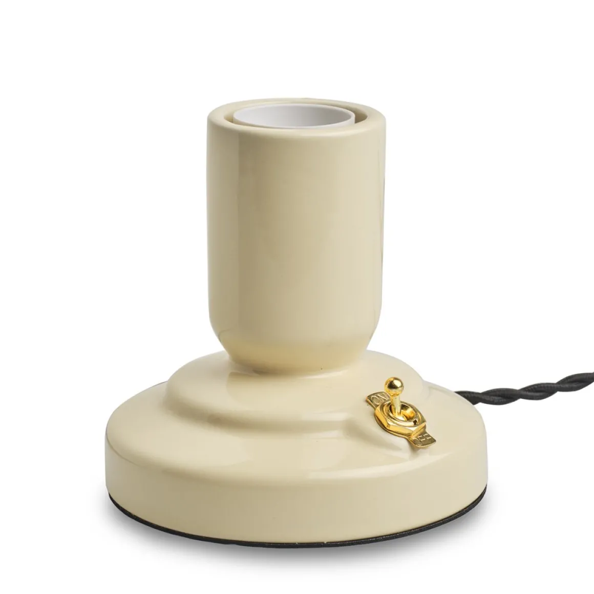 Läckert Retro lampfot från unison med kropp i beige porslin med vippströmbrytare i mässing perfekt kombinerad med en tvinnad lampsladd i tyg. Tjusigt!
