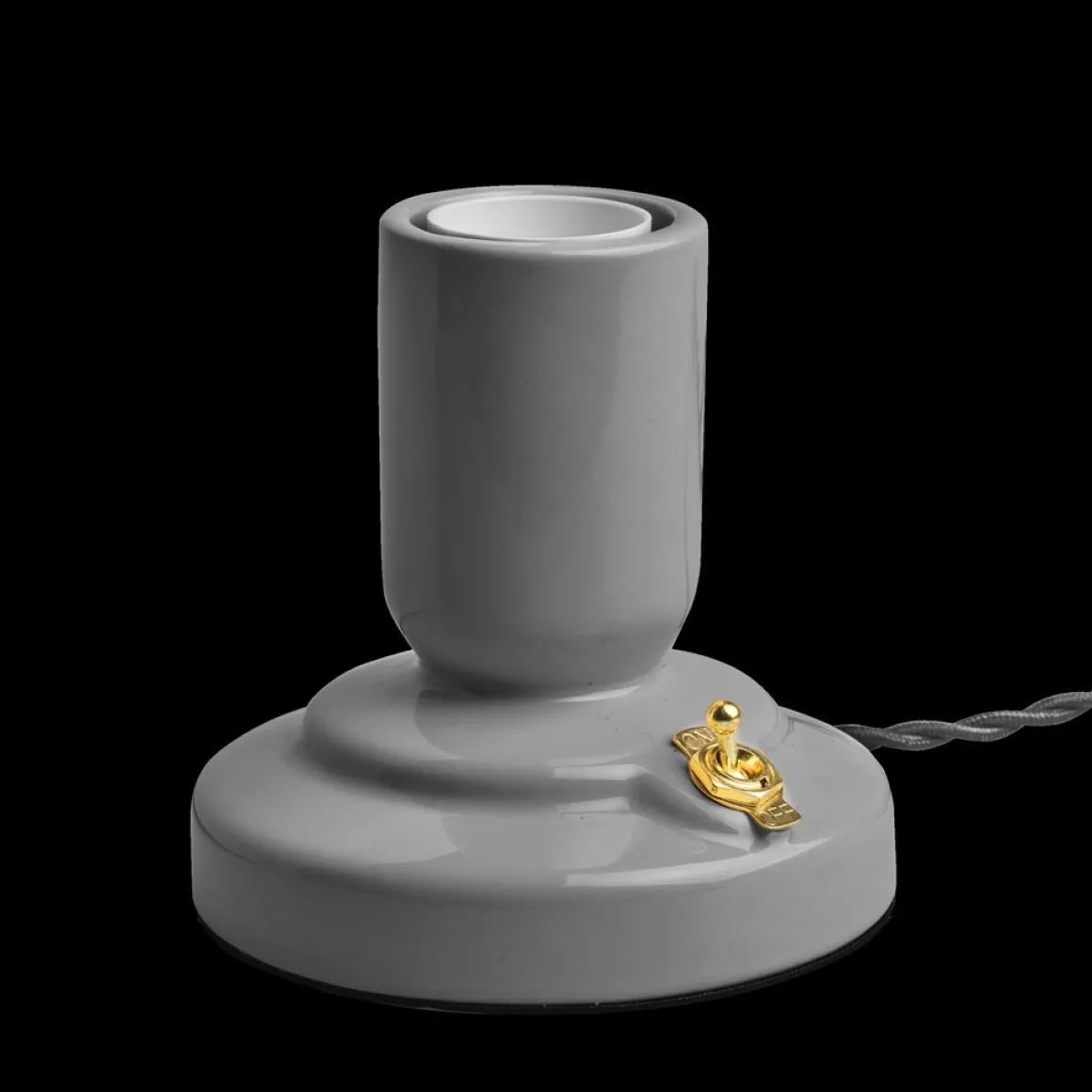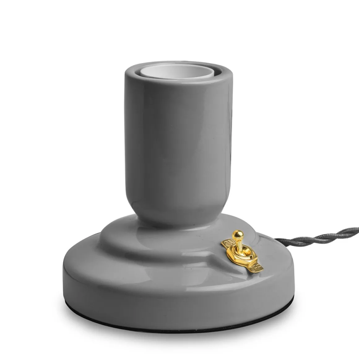 Läckert Retro lampfot från unison med kropp i grålackad porslin med vippströmbrytare i mässing perfekt kombinerad med en tvinnad lampsladd i tyg. Tjusigt!