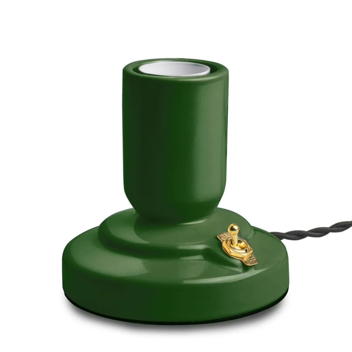 Läckert Retro lampfot från unison med kropp i grönlackad porslin med vippströmbrytare i mässing perfekt kombinerad med en tvinnad lampsladd i tyg. Tjusigt!