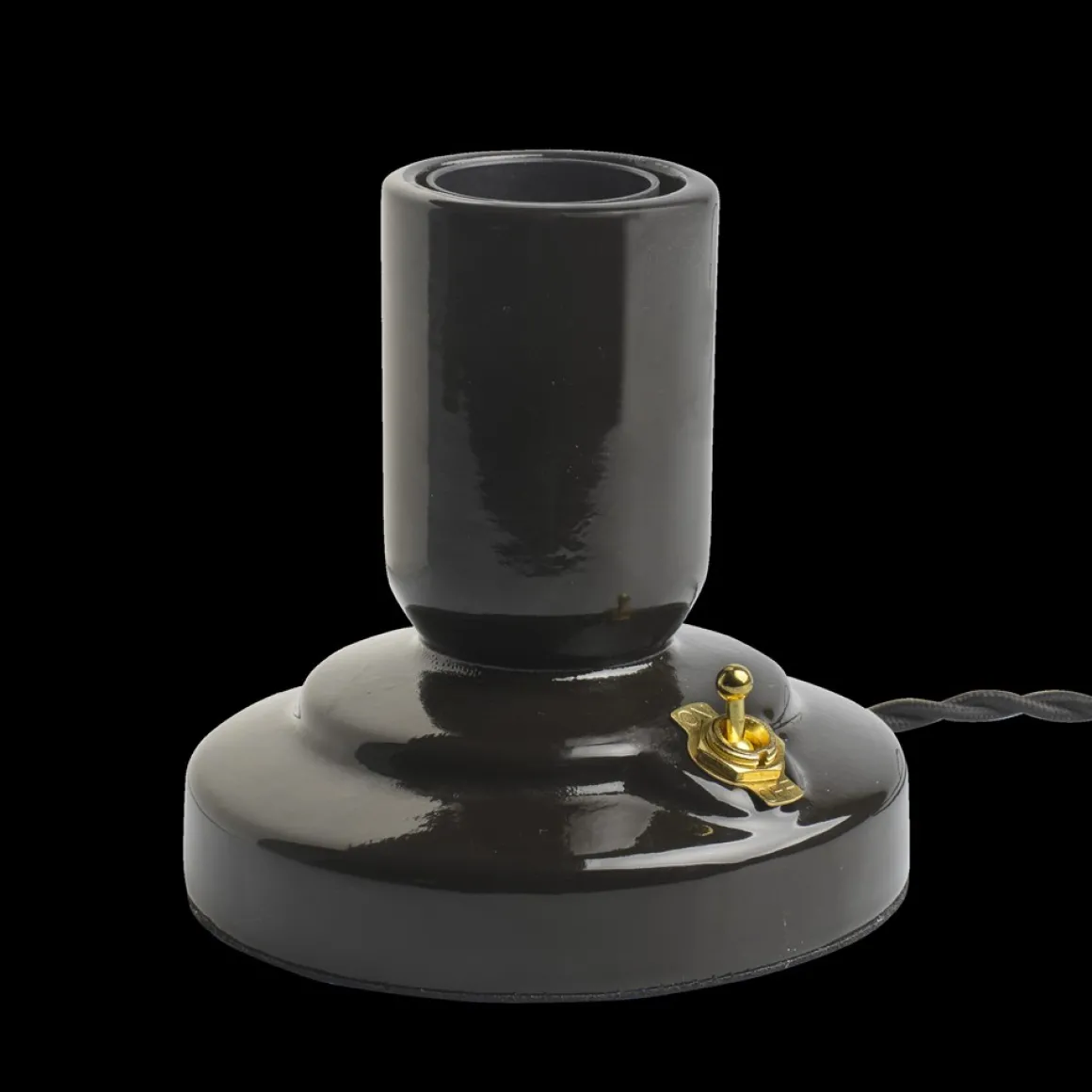 Läckert Retro lampfot från unison med kropp i svartlackad porslin med vippströmbrytare i mässing perfekt kombinerad med en tvinnad lampsladd i tyg. Tjusigt!