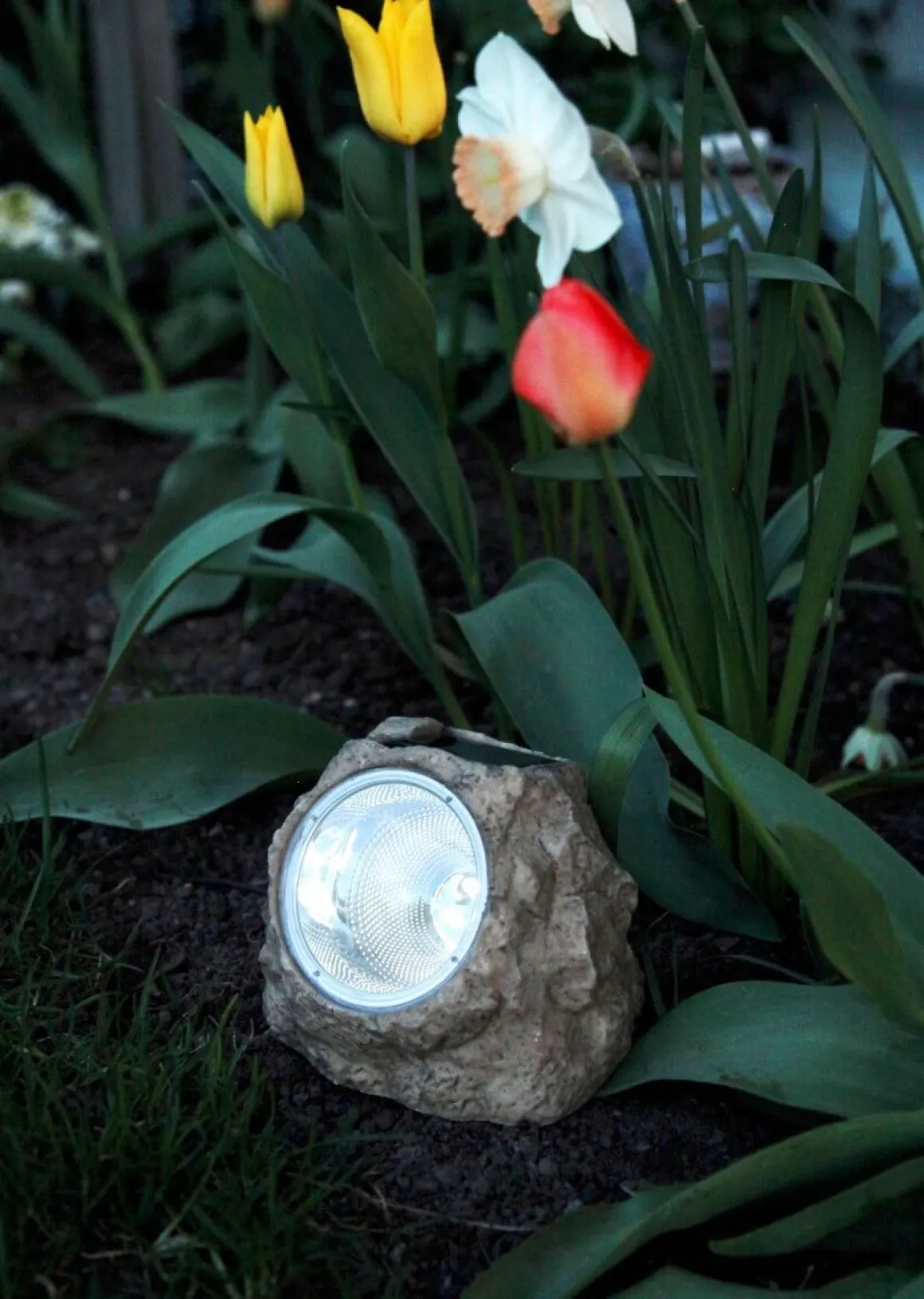 Praktisk liten solcellsdriven ”sten”, perfekt att lysa upp en liten blomma med.