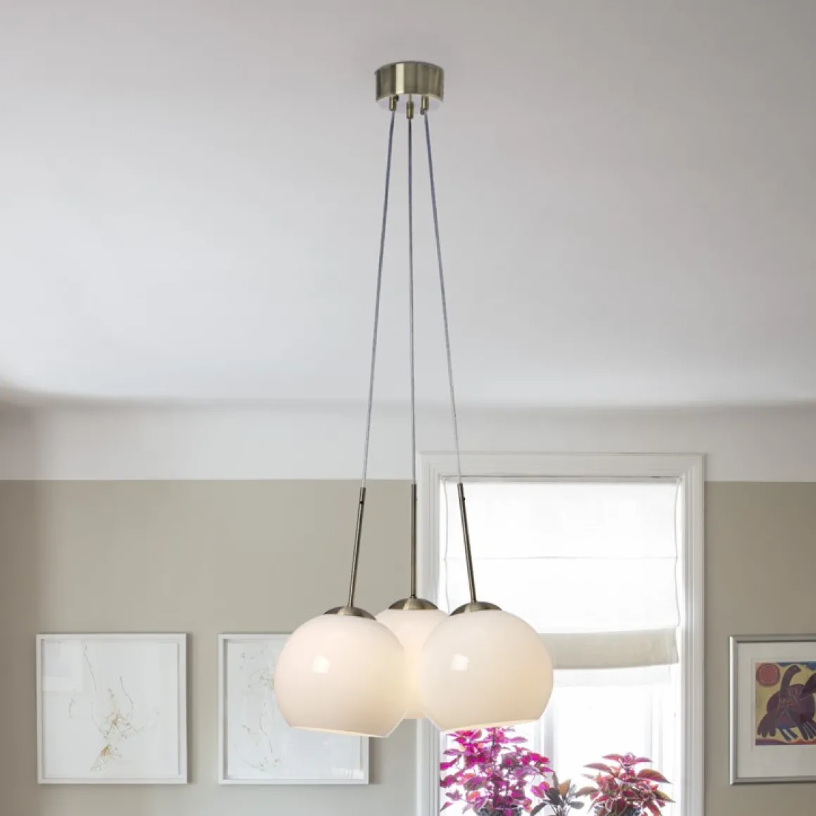 Salle Taklampa från Cottex i ny tappning. En tuff lampa med stomme i antikmässing och 3 stycken opalvita kupor som sitter ihop i samma höjd (du kan givetvis justera dem så att dem sitter i olika höjder också om du vill det). En tuff nykomling som sticker ut med sin runda mjuka form och enkla stilspråk. Monteras gör den snabbt och enkelt på en takkrok. Stickkontakt köpes separat.