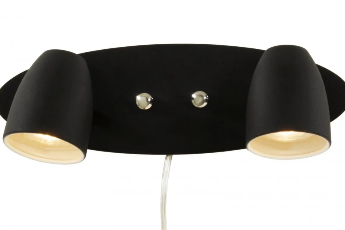Dubbel sänglampa av modellen Sandnes från Aneta, perfekt läslampa med en dimmer till varje spotlight så ni slipper enas om ljusstyrkan 😉 Här ser du Sandnes i svart.
