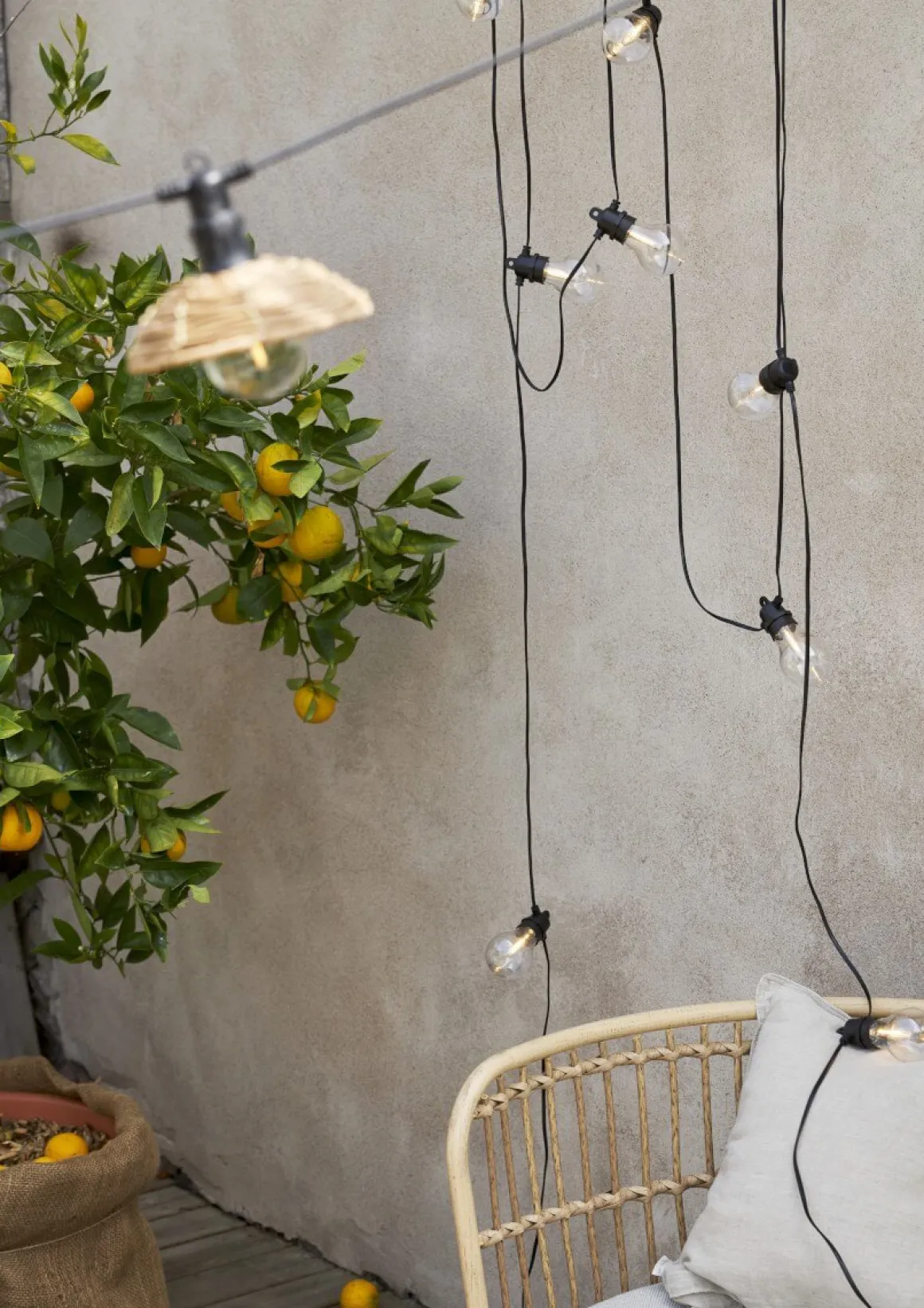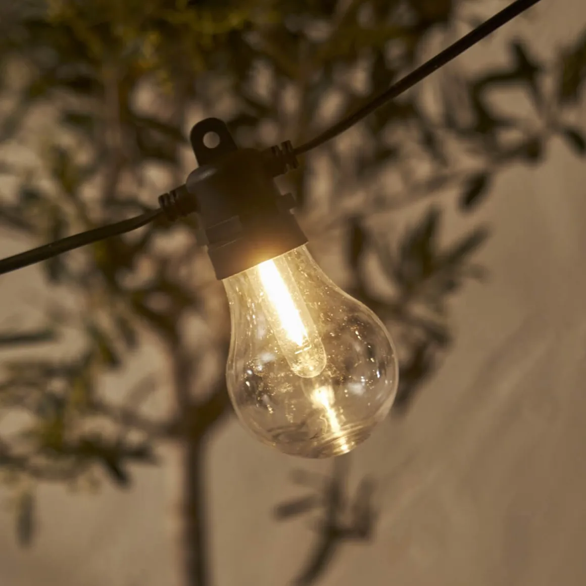 En ny slinga från Star trading med utbytbara LED som finns i två längder. Den här slingan med 10 LED är ca 7 m lång och den andra slingan med 18 LED drygt 13,5m lång. Ljuskällan är i LED Filament och ger ett snyggt varmvitt sken. Transparent hölje i A60 storlek (samma storlek som en Normallampa) som även finns som reservdel. Perfekt dekoration till vardags och fest. Timerfunktion i transformatorn. 1 st reservlampa medföljer i förpackningen.