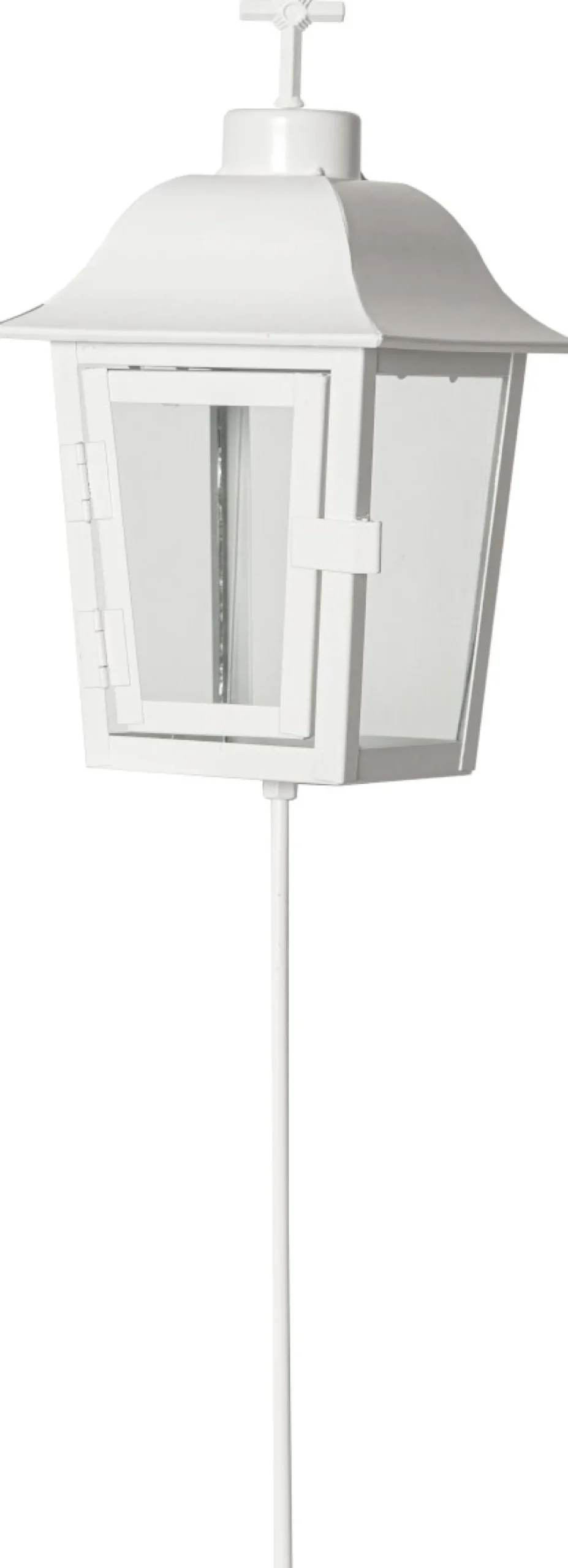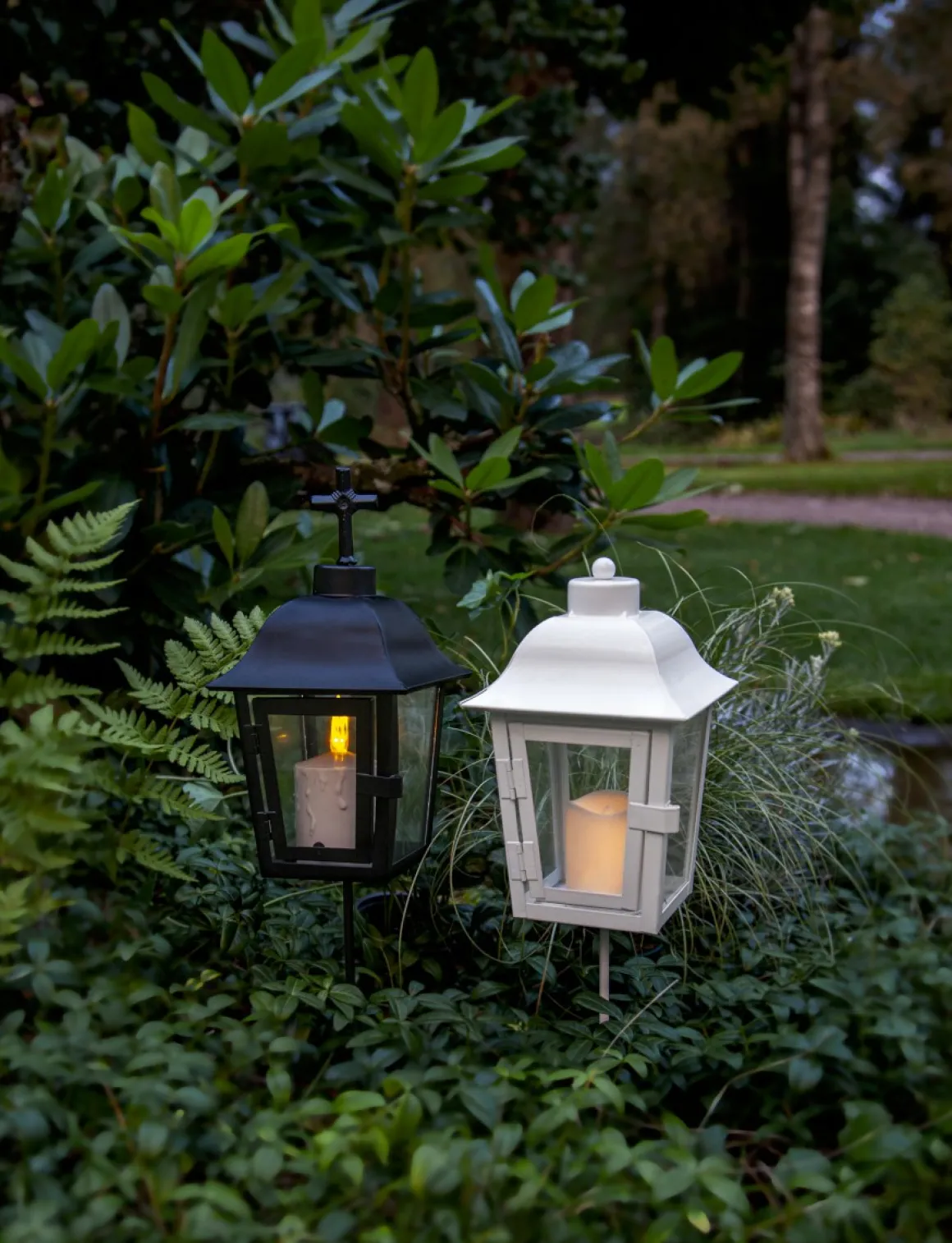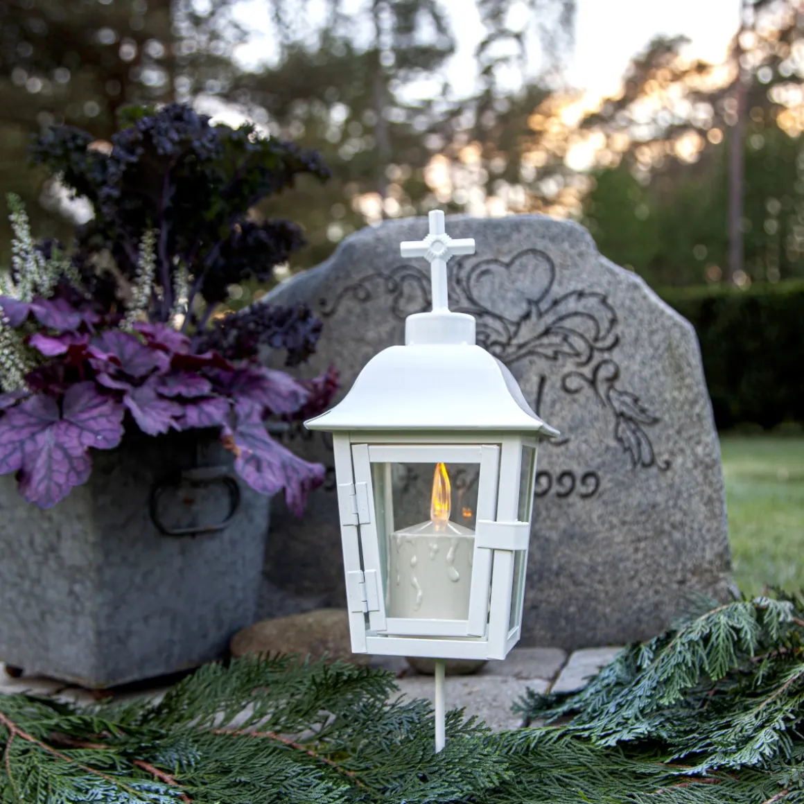 Vacker gravlykta i vit metall från Star Trading. Lyktan är 21cm hög, och markpinnen är 25cm hög. Med lyktan kommer också två olika toppdekorationer, du väljer själv den som passar dig bäst. Kombinera lyktan med något av våra sensorljus för utomhusbruk tex 066-20.