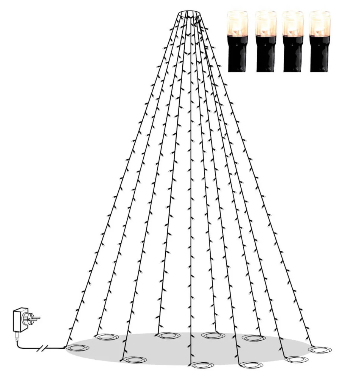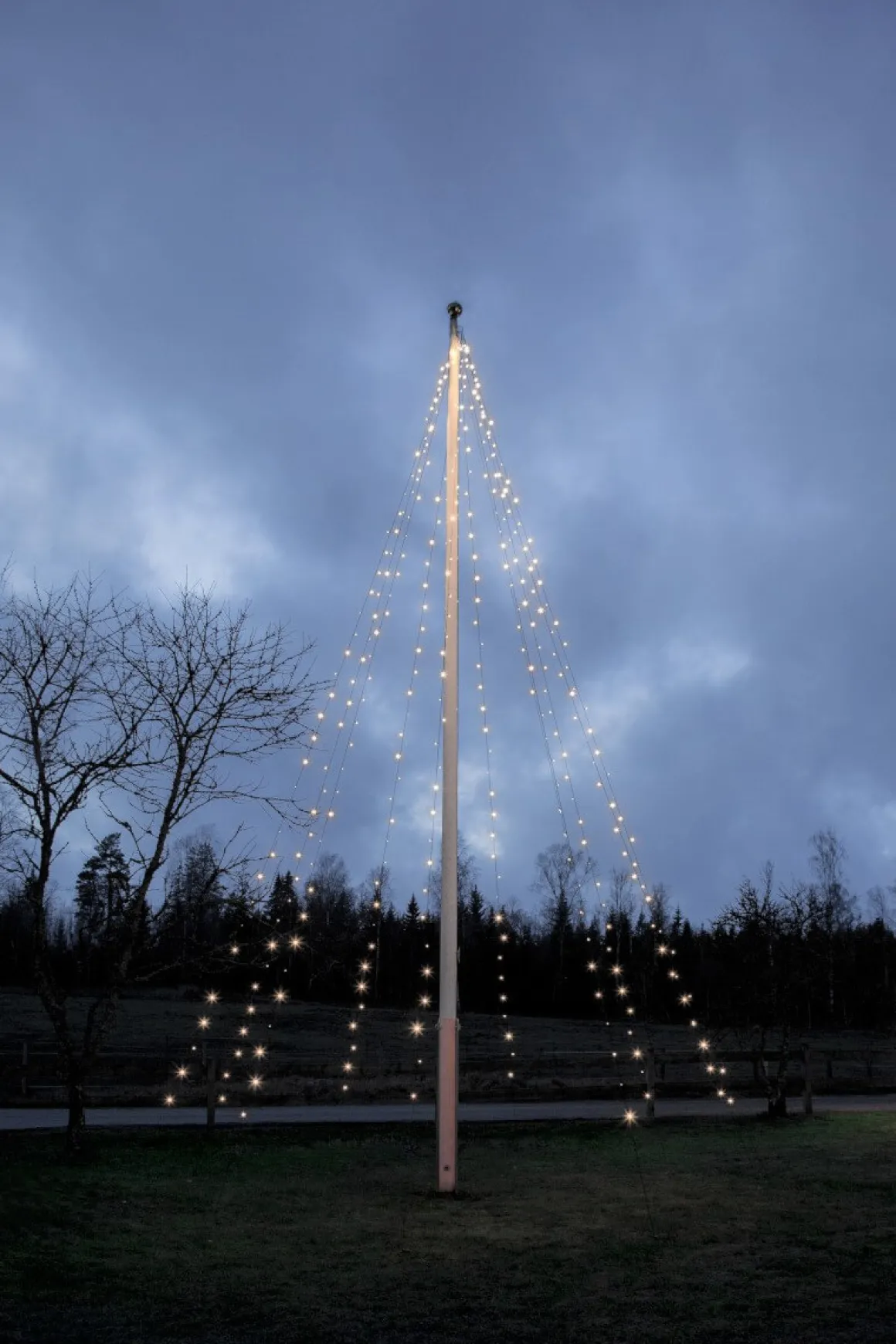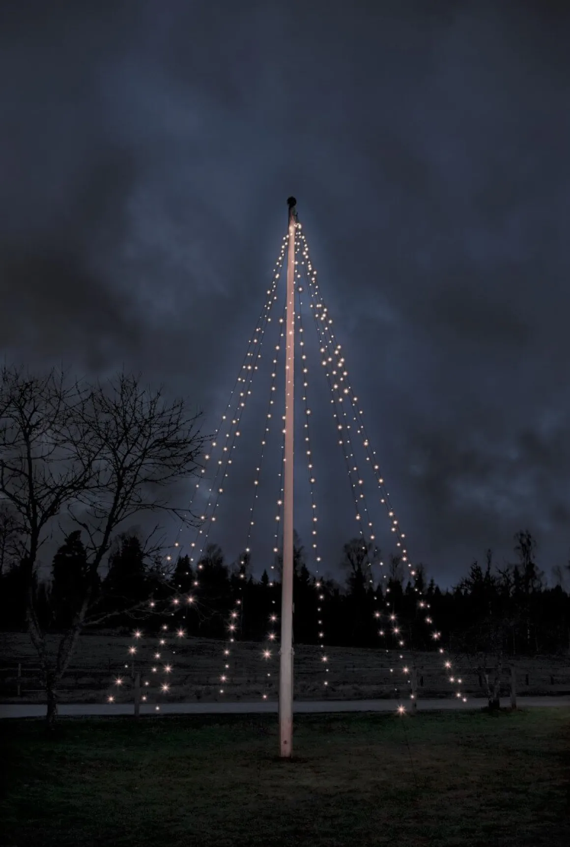 Svart ljusslinga från Star Trading till flaggstänger. Slingan har 360 LED-ljuskällor med ett vackert lite kallare sken fördelade på 10 slingor. Längden på ljusslingan är 7m med 10 m långa nylonsnören för fastsättning i marken.