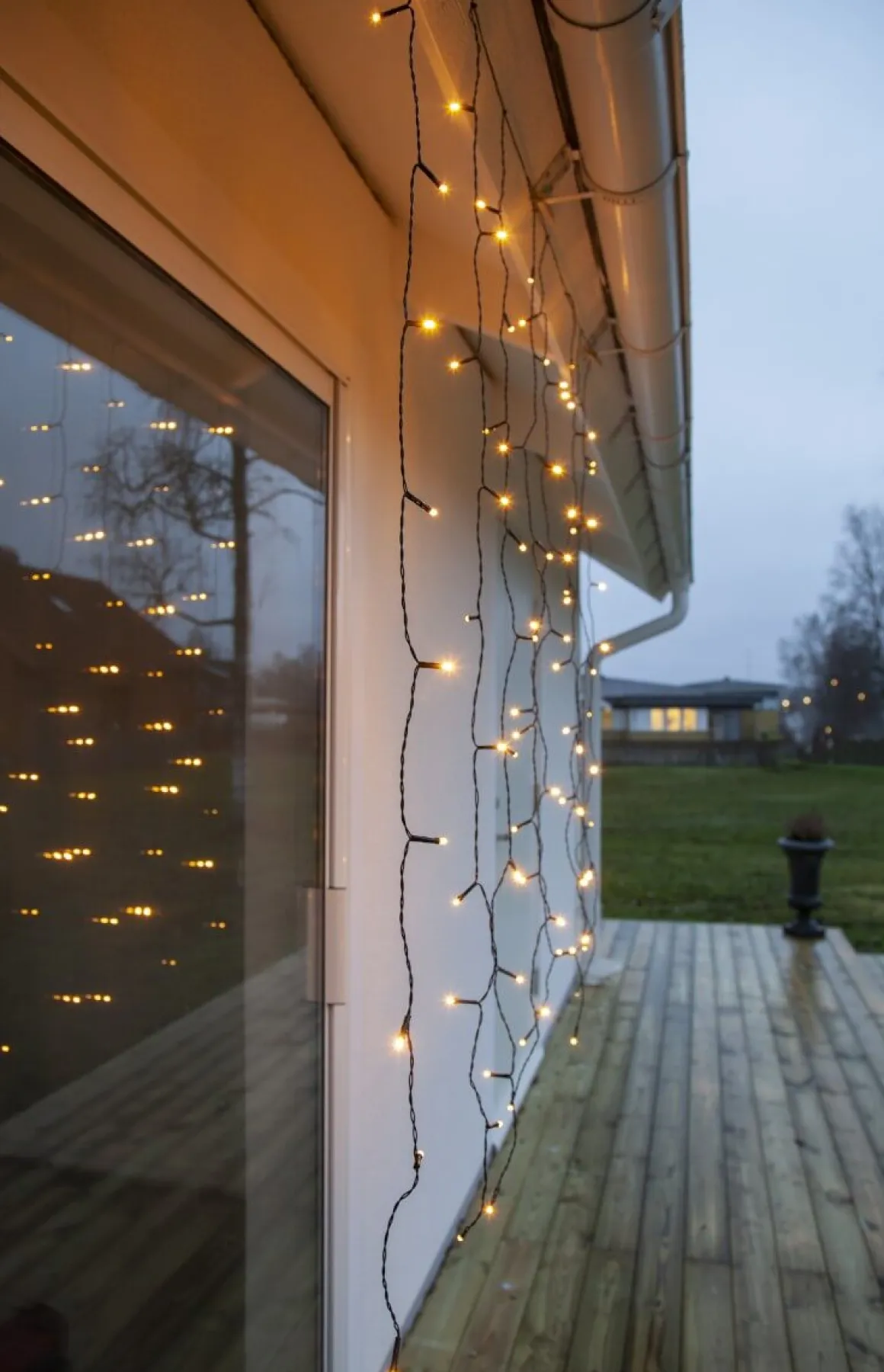 Gardinslinga med 80 LED lampor med vackert gyllene ljussken från star trading. Gardinen har en storlek av 1,3×1,3m. Perfekt för dekoration i din trädgård eller på huset.