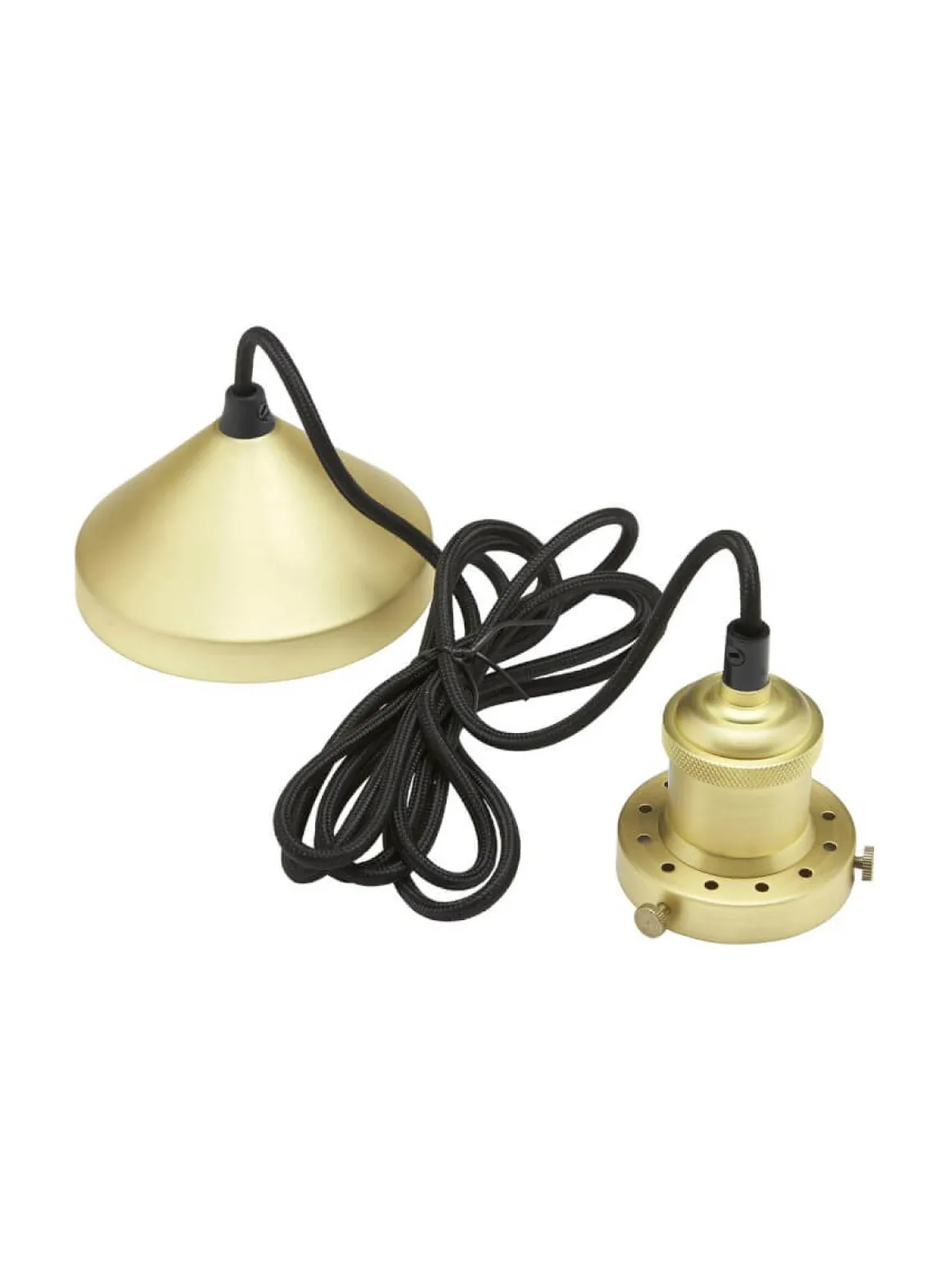 Siri takupphäng i läcker borstad mässingsfärg. 2,5m svart textilkabel med takkopp för krokupphäng. Skärm, ljuskälla och takkontakt ingår ej. Upphänget passar skomakarglas, August och Elly.