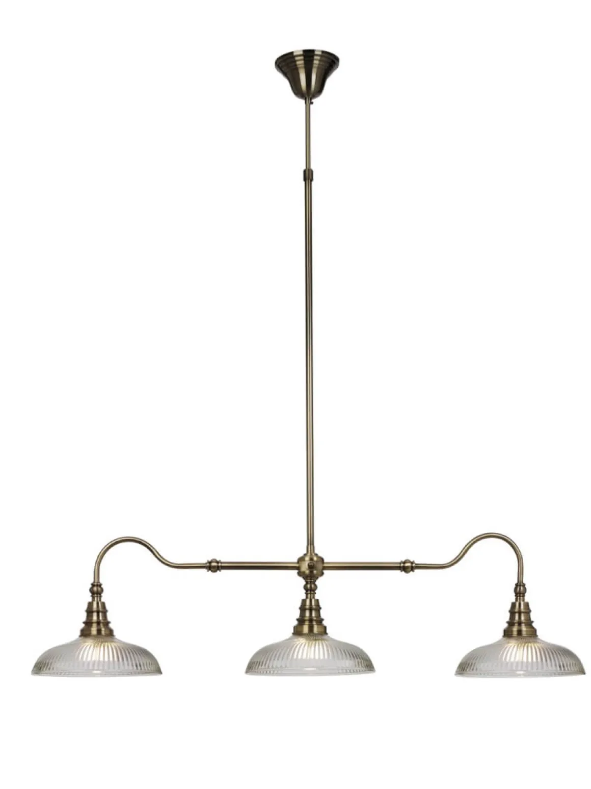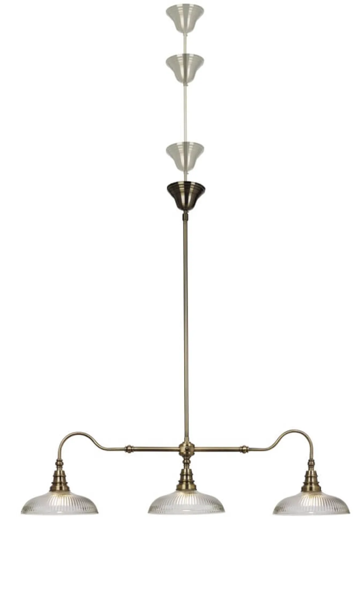 Vacker taklampa i gammal stil men med ett modernt intryck. Snooker har en stomme i antikfärgad metall ljuvligt kombinerad med räfflade kupor i klarglas. Krokupphäng? Självklart – för en snabb och smidig installation.