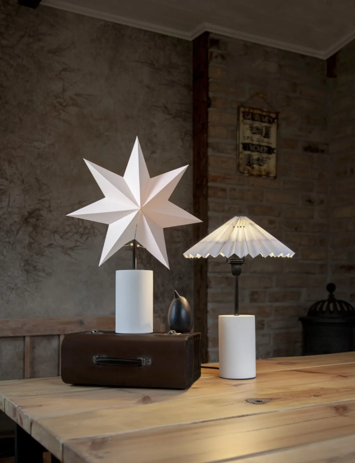 Stjärna och skärm, Stila är en komplett året runt lampa från Star Trading. Vit fot tillverkad i trä och svarta detaljer som ger den lilla extra touchen. Stjärnan är den perfekta stilrena dekorationen till jul och advent. Placera den i ett fönster eller på en skänk. Sprider härlig julstämning, när julen är över byter du till den läckra veckade skärmen och får på så sätt en perfekt dekoration hela året.