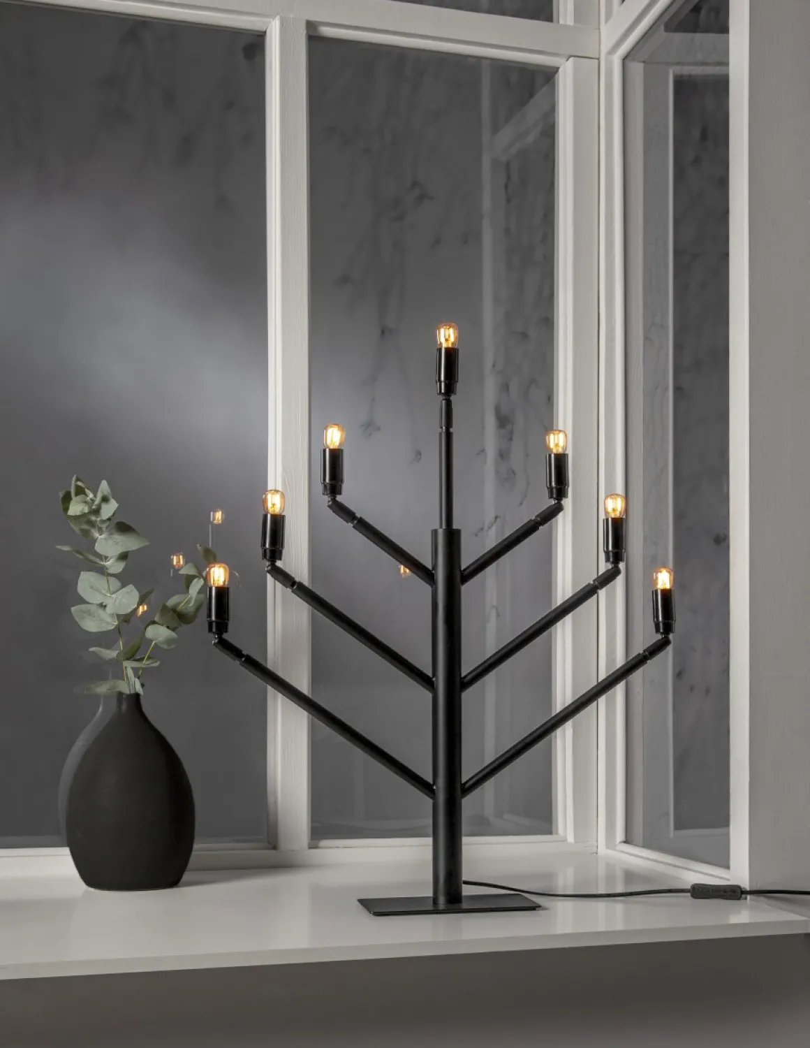 Exklusiv, stilren och modern svart metalljusstake från Star Trading. Köp till valfri ljuskälla och ge din ljusstake din egna personliga touch. Vridbara lamphållare som kan riktas och ändra ljusstakens utseende. Skapar julkänsla i ditt hem från år till år.