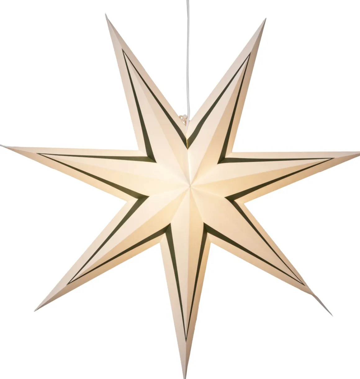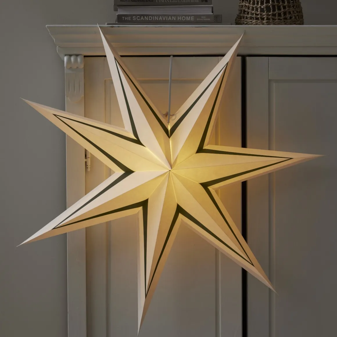 Lys upp julen med Adventsstjärna Randig från Star Trading! Denna vita stjärna med mörkgröna ränder i FSC®-märkt papper sprider härlig julstämning. Häng i fönster eller på vägg. Köp till sladdställ och ljuskälla för ett varmt sken. Perfekt för advent och jul!