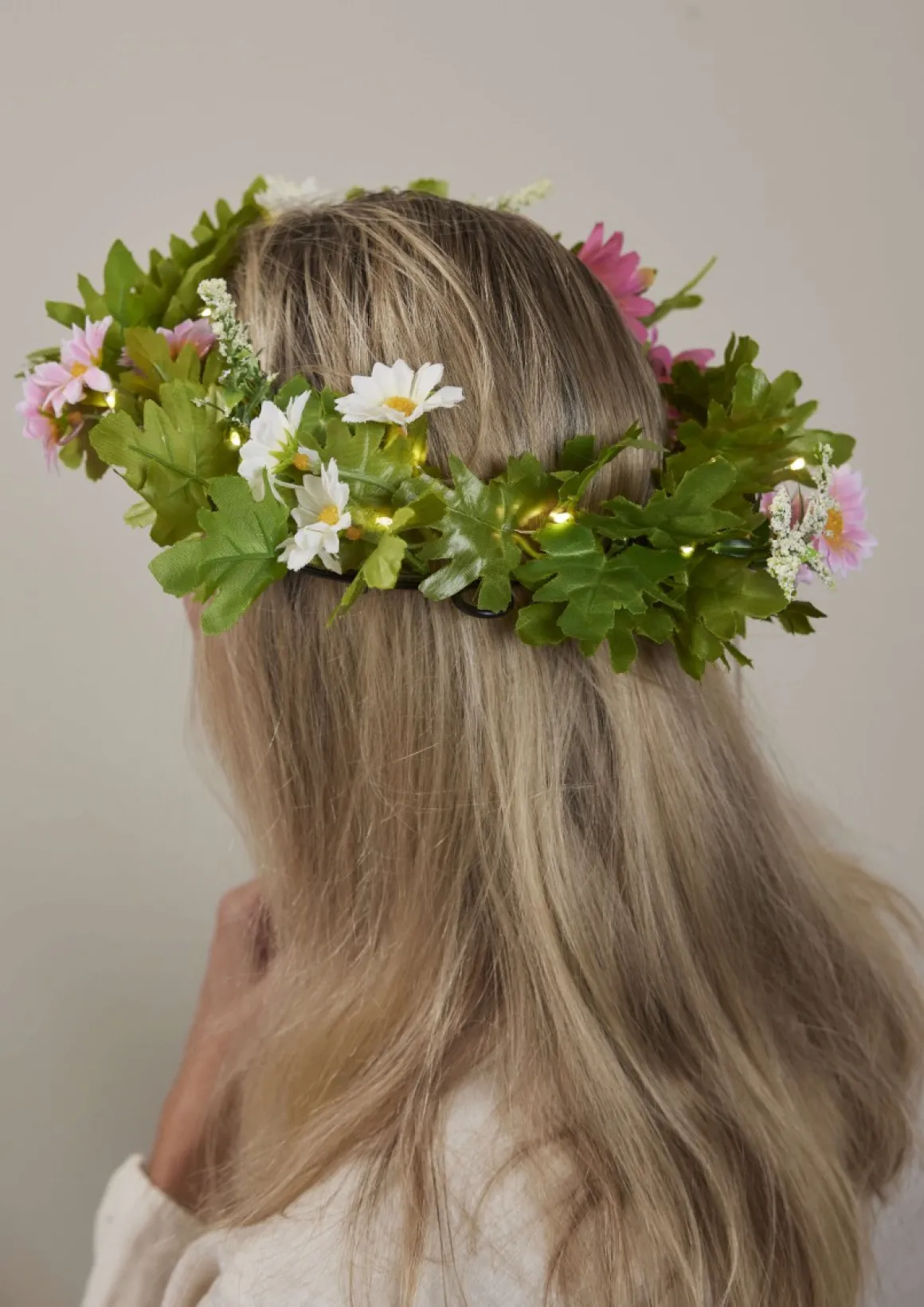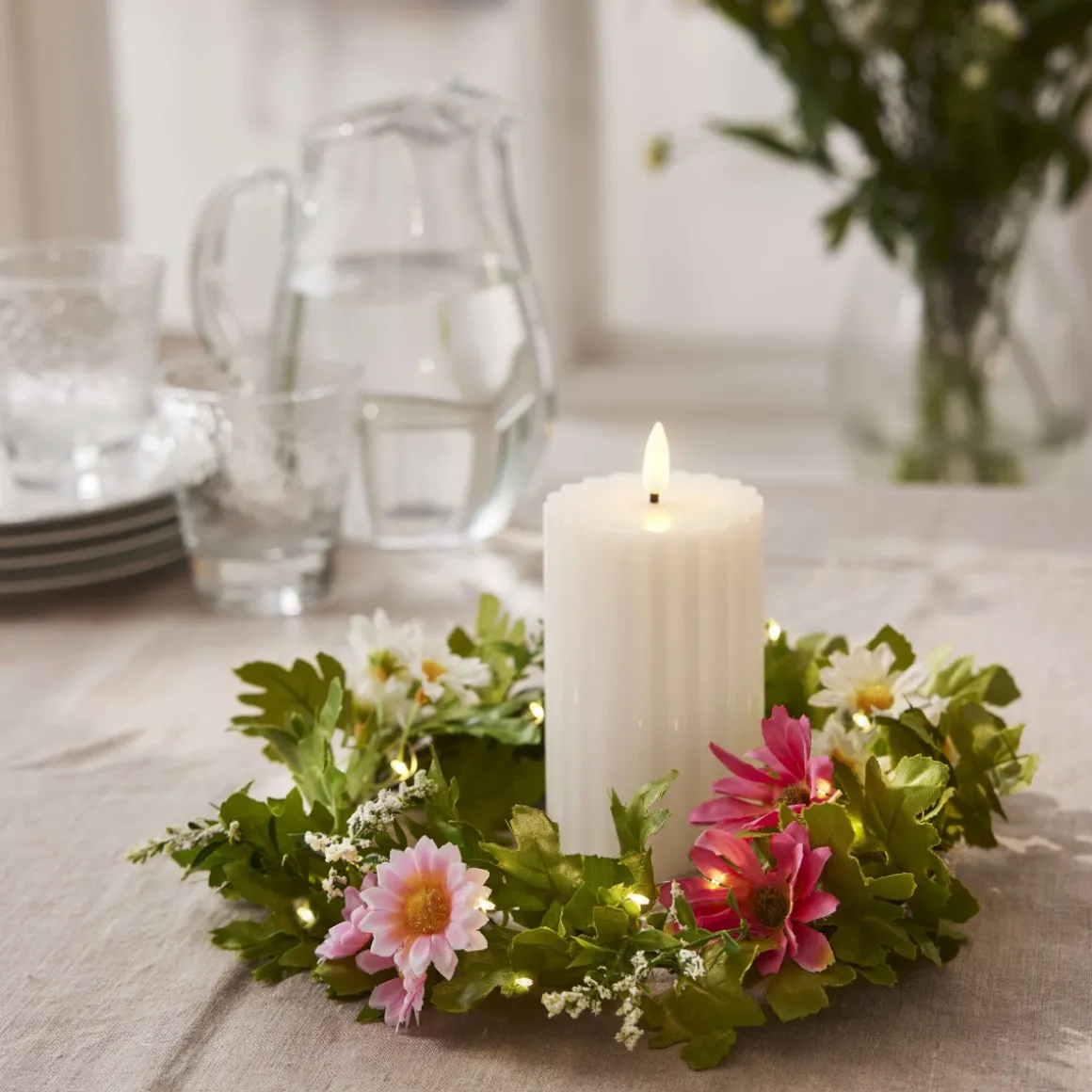Denna vackra krans med sommarblommor i vitt och rosa sprider ett mjukt och behagligt ljus med sina 15 varmvita dewdrop LED-lampor. Perfekt för att dekorera dörren, fönstret eller som en fin detalj på ett bord – varför inte använda den som en midsommarkrans? Den har en metallstomme på 20 cm i diameter och drivs av 2xCR2032 batterier (ingår ej).