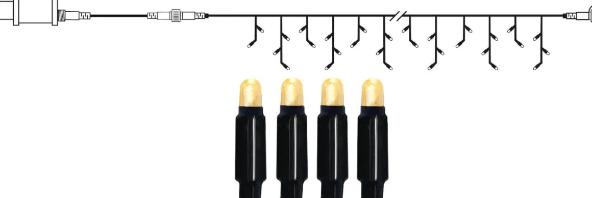 Startenhet med istappsslinga och transformator. Slingan har 49 st varmvita ljuspunkter och är 3×0,4m och levereras tillsammans med en startkabel och transformator på 24V 9,6W