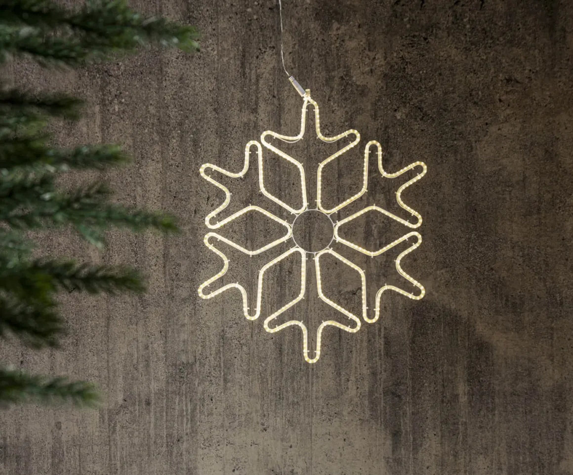 Vackert lysande siluett med formen av en snöflinga. Runt hela siluetten lyser det hela 480 små små varmvita led lampor. Perfekt att hänga på en dörr eller mot fasaden.