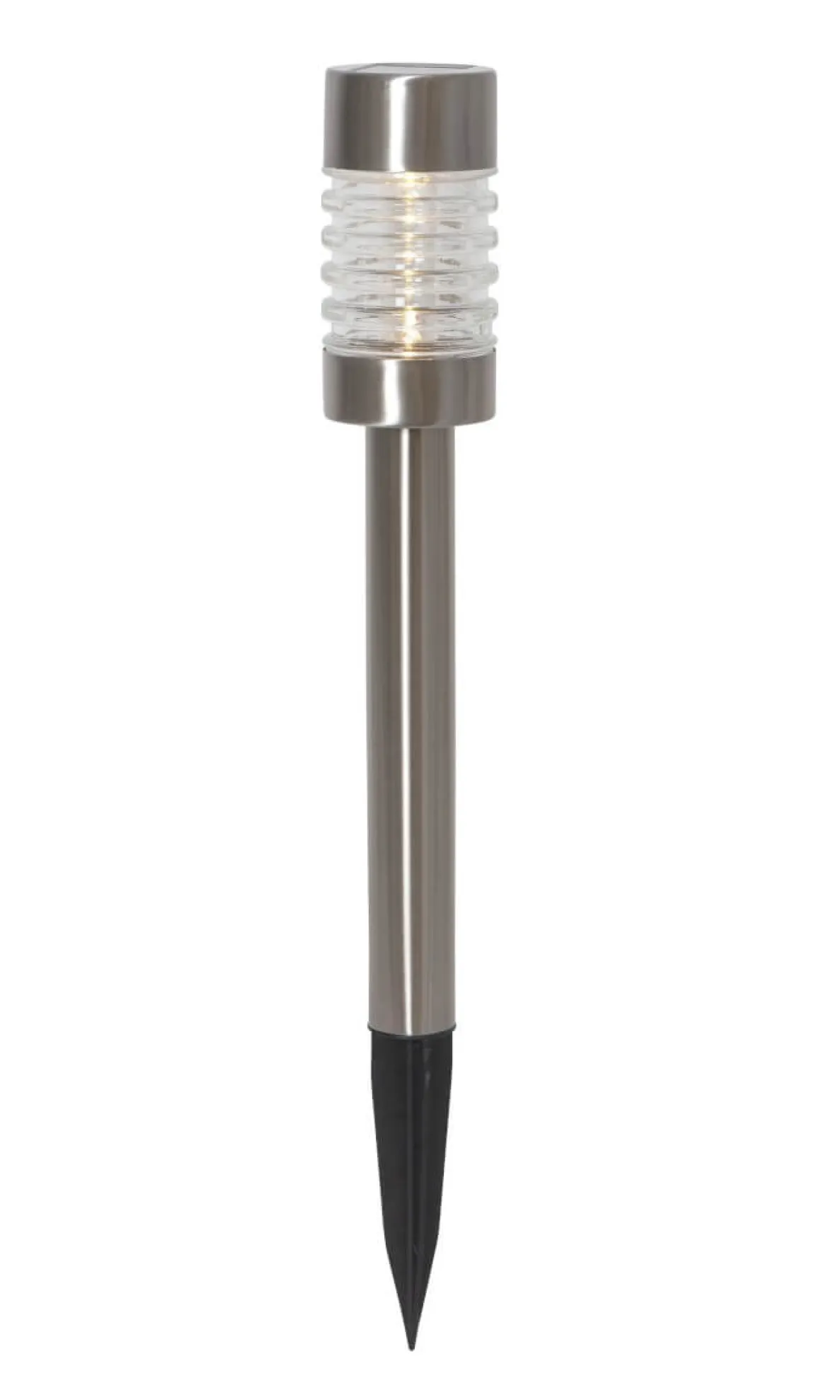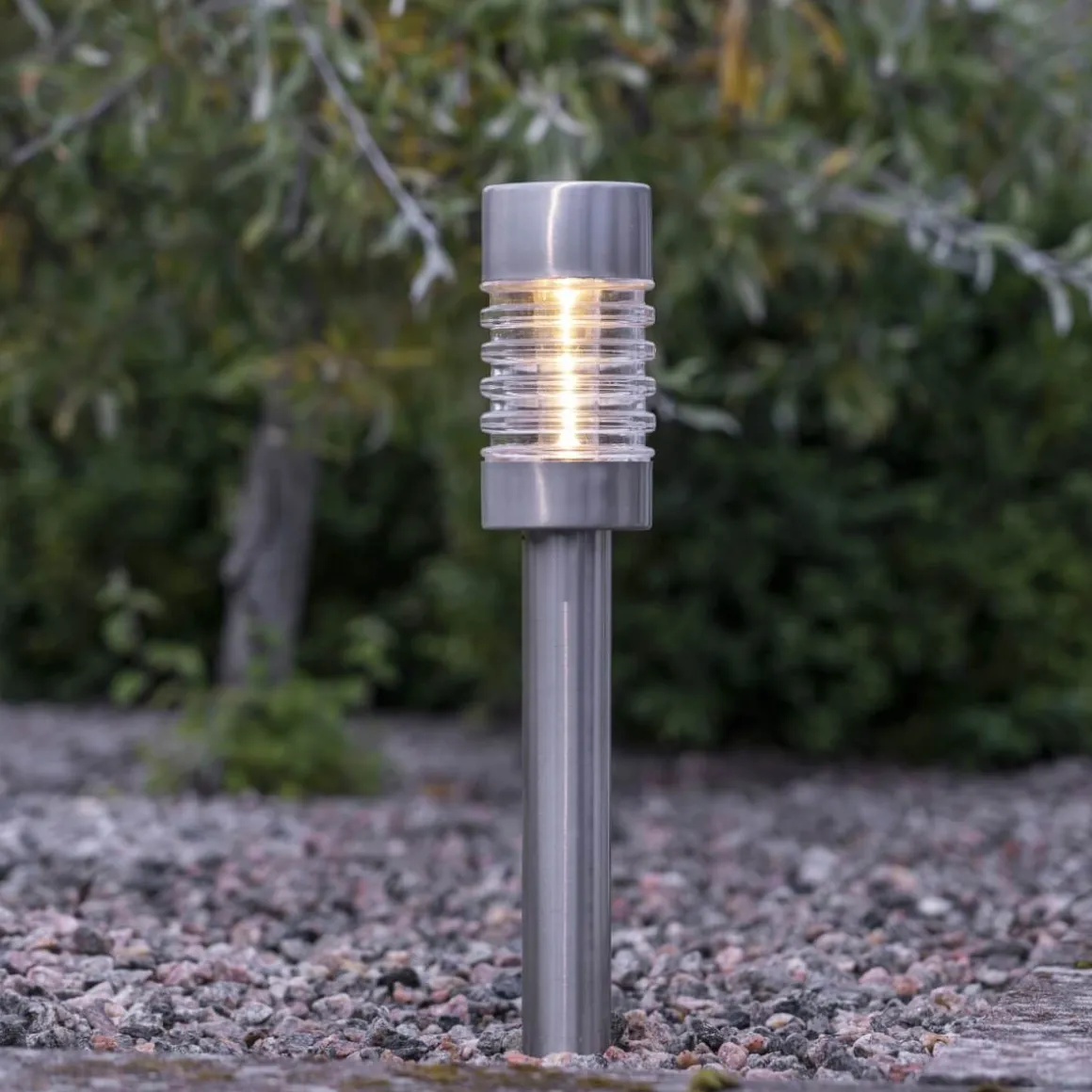 Härlig solcellspollare från Star Trading med kropp i borstat stål och ett räfflat glas som bryter ljuset på ett vackert sätt. Perfekt att belysa en rabatt eller en gångstig med under sommarkvällarna.