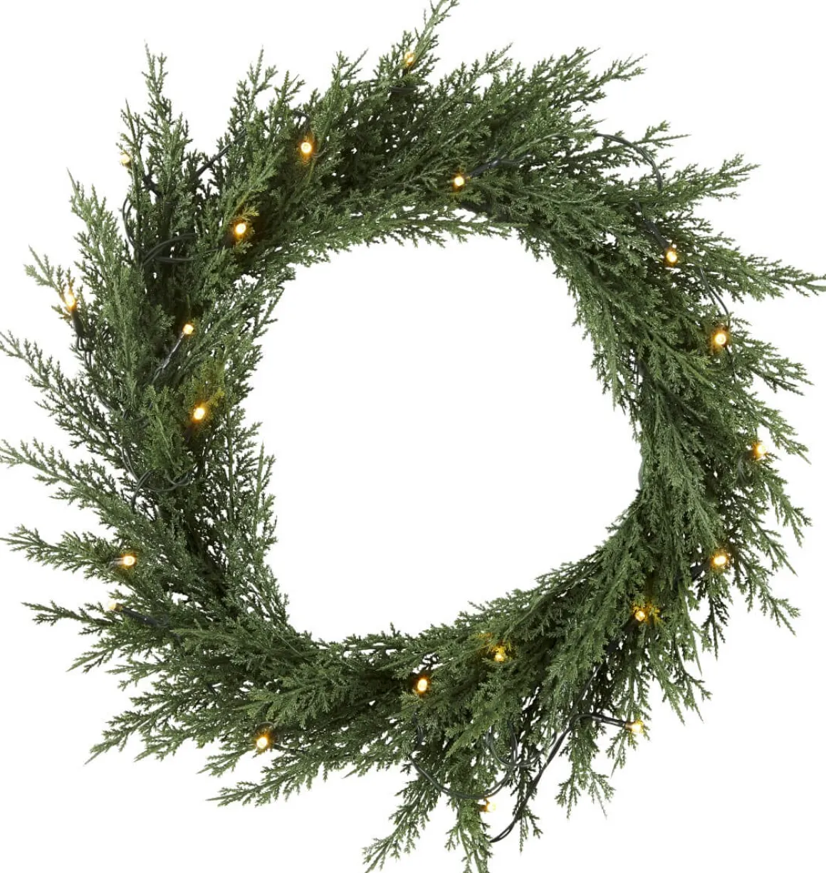 Vacker dörrkrans gjord i full PE med Thujablad och 20 varmvita LED-ljuskällor. Drivs med batteri och har en inbyggd timer så du enkelt kan ställa in när du vil att den ska lysa. För inomhus eller utomhusbruk.