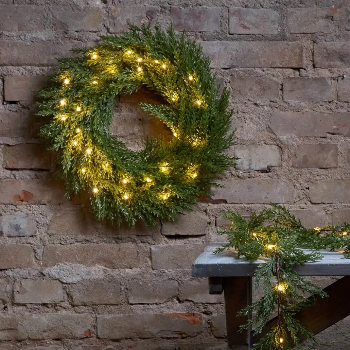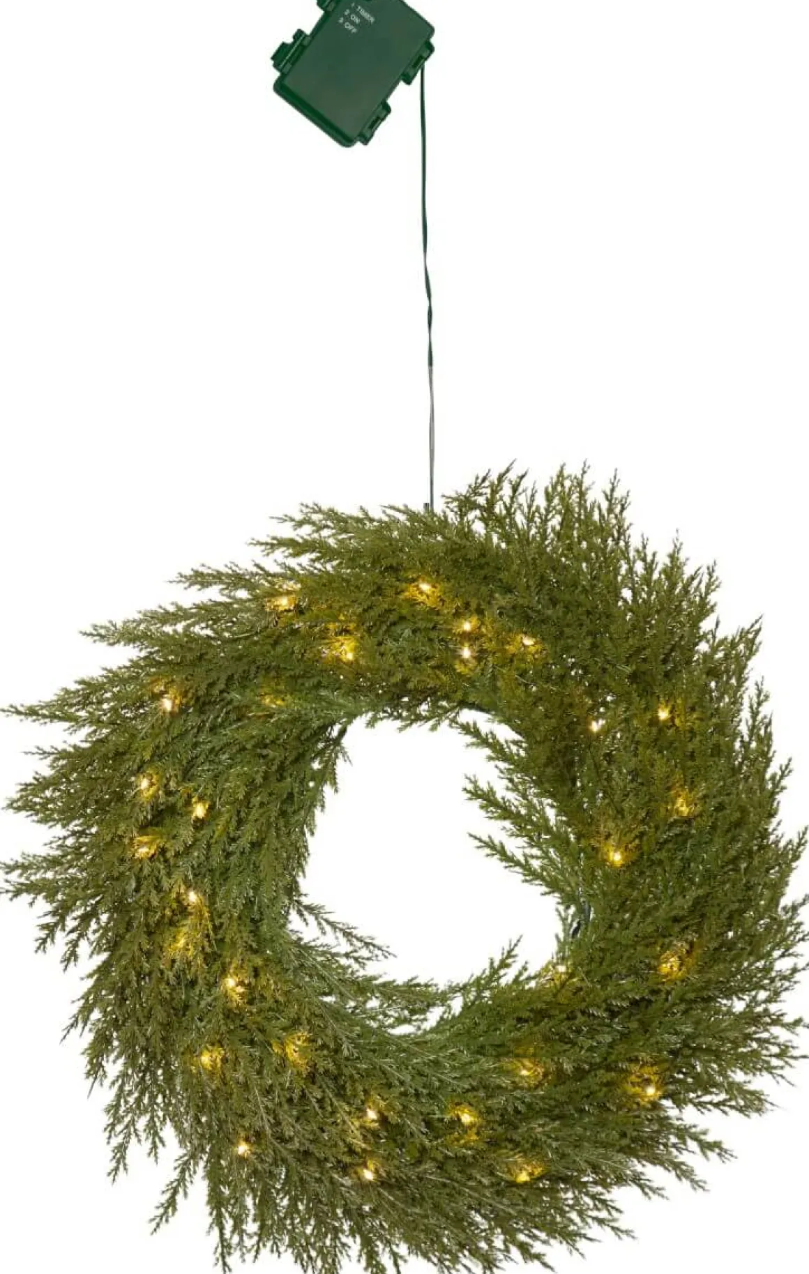 Vacker dekorationskrans med Thujabarr. Kransen är 45 cm bred och inuti den göms 30 stycken små varmvita ljuskällor som drivs med 3 AA Batterier och timer. Thuja är godkänd för både inomhus såväl som utomhusbruk. Batterier ingår ej.