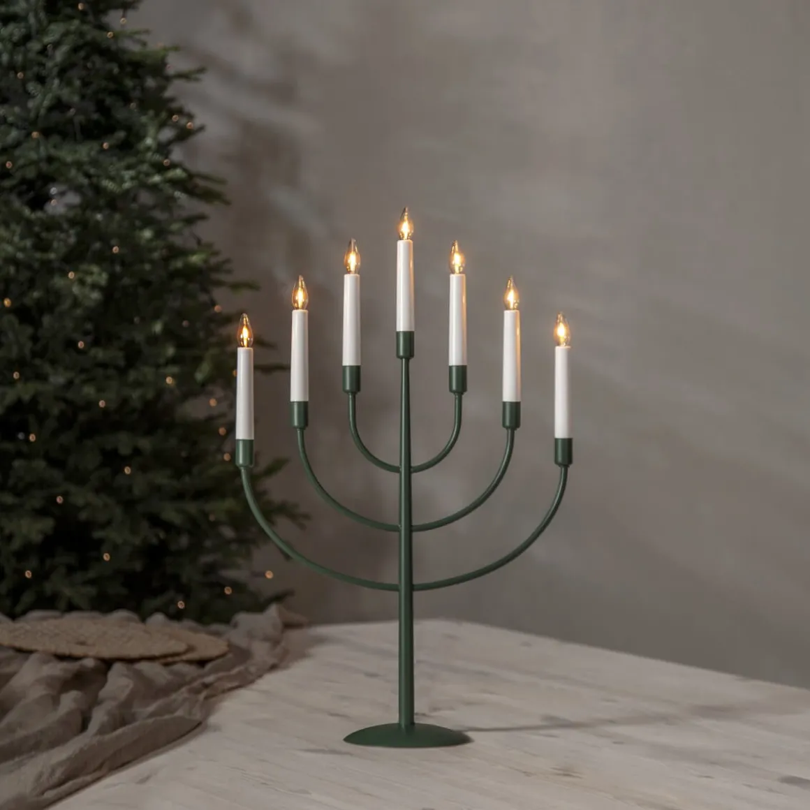 Star Tradings eleganta metalljusstake Titus här i läcker grön färg uppdaterad med den senaste ljuskällan. 7 ljuskällor av modellen soft glow. Sprider ett härligt ljus och skapar julstämning.